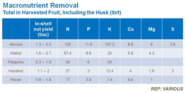 In almonds, average removal is about 100 lb K2O/t of kernels and more than two-thirds of this is found in the hull. Other nut crops remove less potassium and the figures vary depending on whether the hull is also removed with the nut.