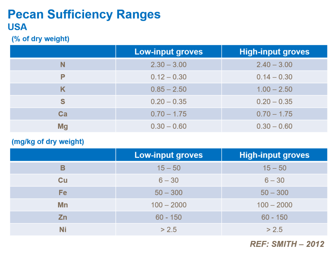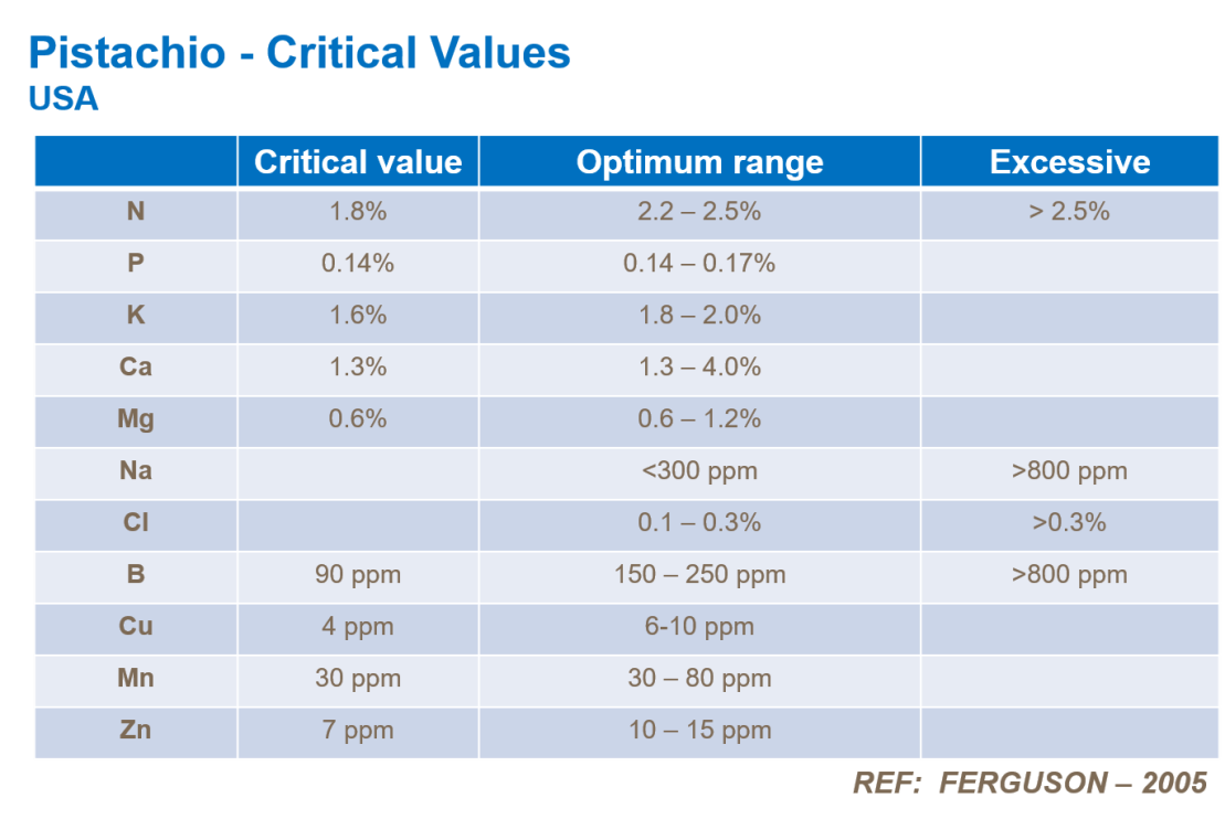 The critical value for potassium varies between 1.0 and 1.8%DM in leaves, dependent on nut type.