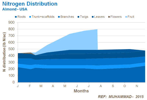 A large amount of nutrients are taken up to build the frame and the canopy of the tree and retained as reserves. For example, as much as 178 lb N/ac is found in almond tree roots and a similar quantity in the rest of the tree’s vegetative components.
