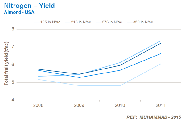 Nitrogen is important to build the tree canopy and encourage vegetative growth, leading to improved bud formation, higher yields, and higher nut protein contents.