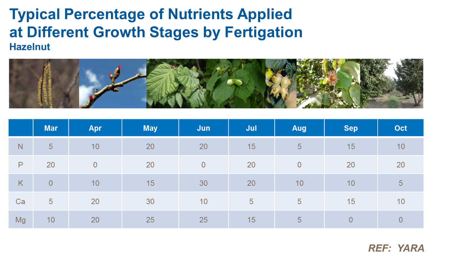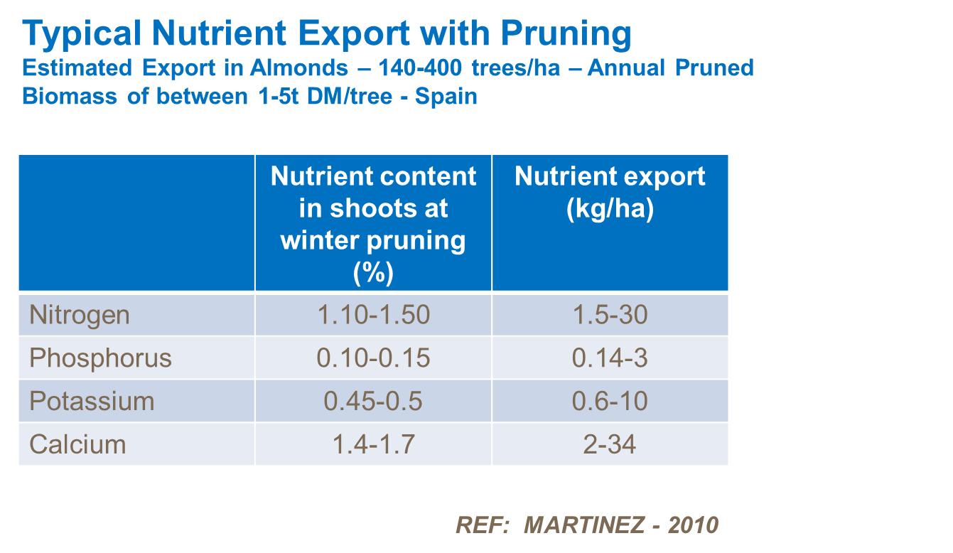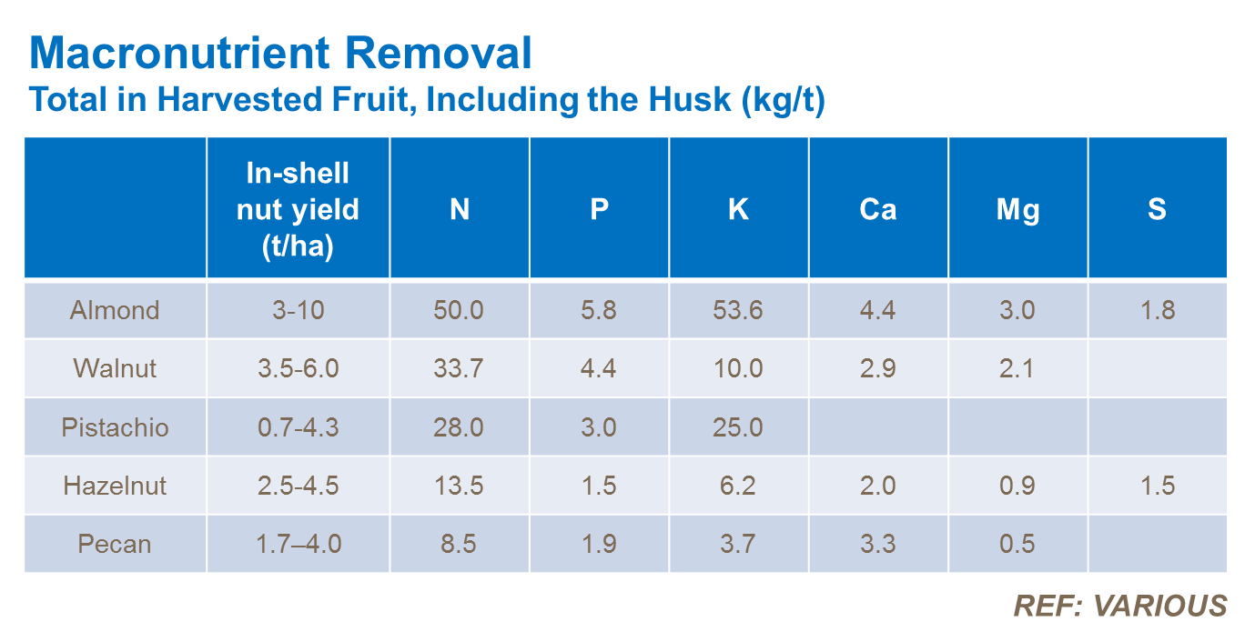 Between 8.5 and 50kg nitrogen is removed for every tonne of nuts harvested. This varies according to nut type; almond is the most N-demanding nut tree species.