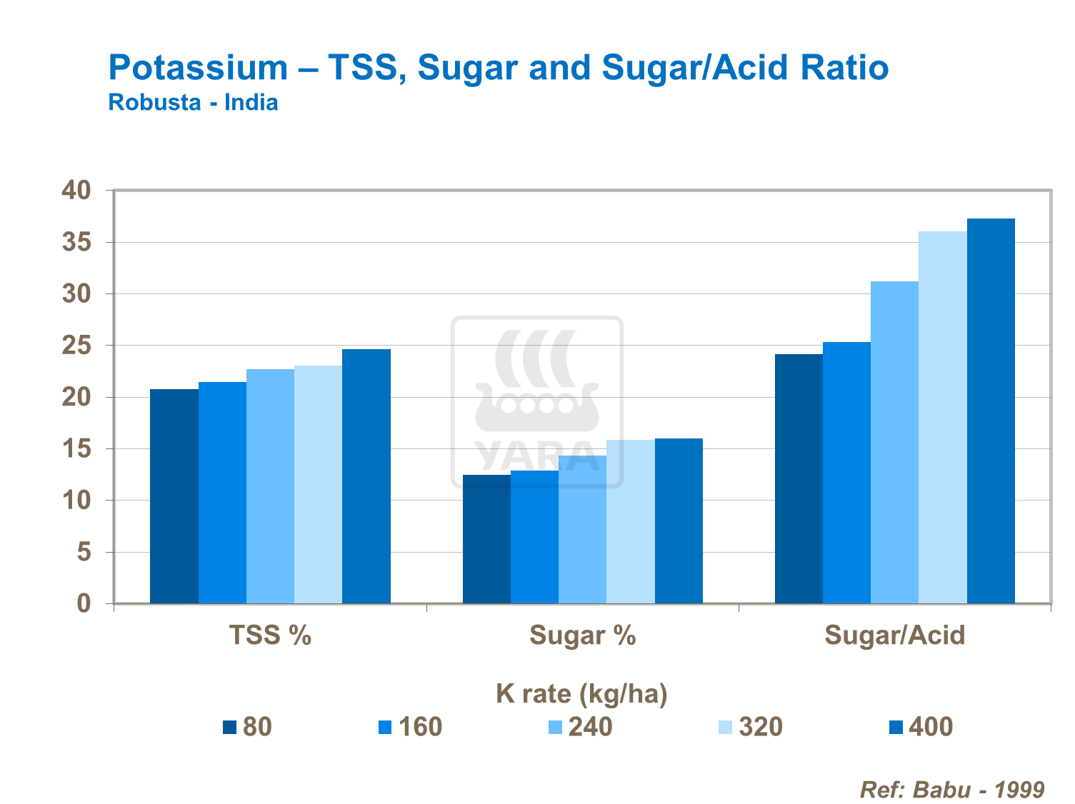 High rates of potassium increase the Total Soluble Solid (TSS) and sugar content of the fruit, increasing the sugar/acid ratio.
