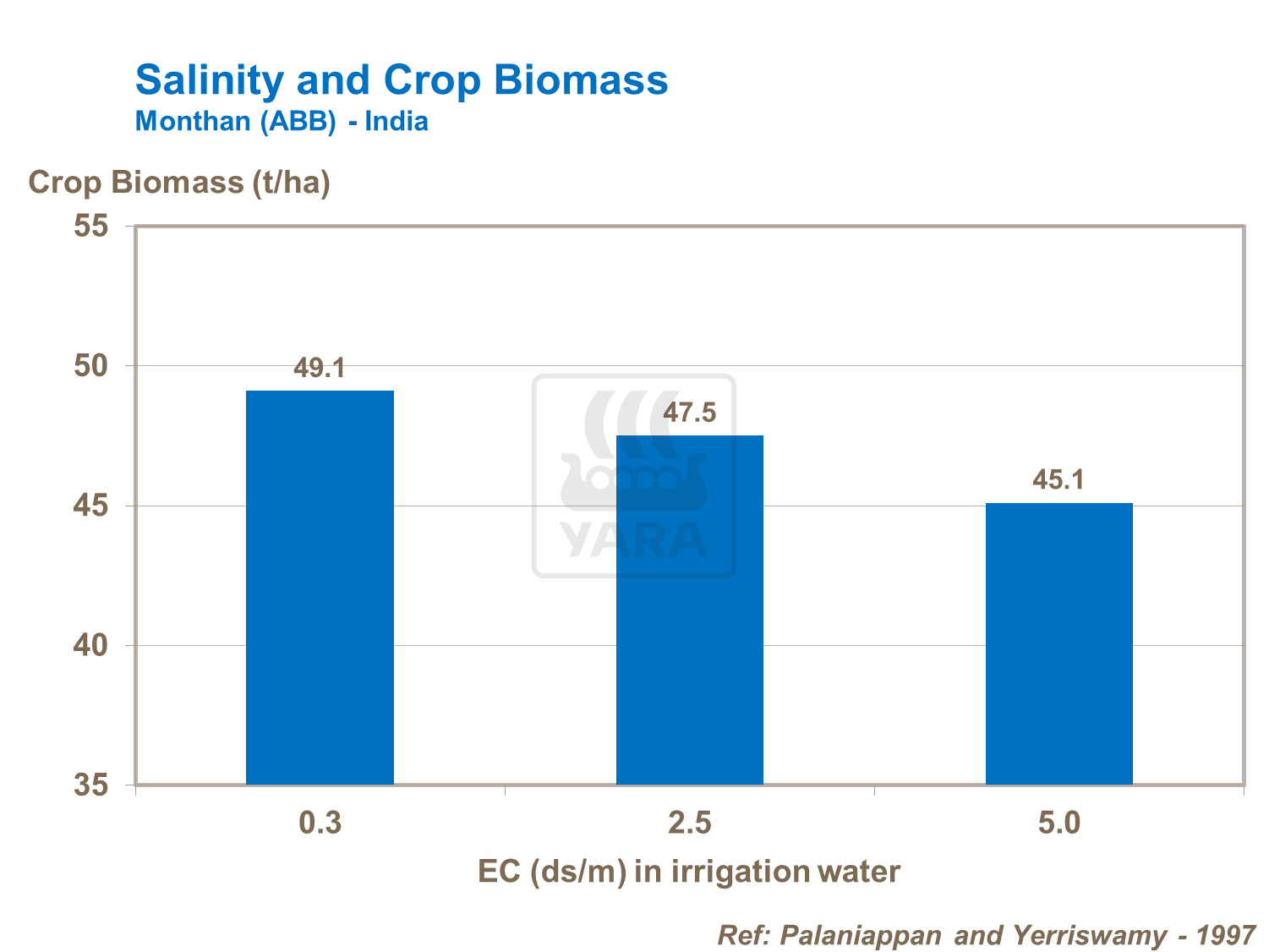 When the level of total soluble salt in soils exceeds an EC of 4 in the soil solution, plants and fruit are visibly affected. Salinity levels above this result in plant stunting and senescence. Even in the absence of visual stress symptoms, salinity restricts root and above ground plant growth (Figures 4 and 5). Plant height, circumference and leaf area, can all be adversely affected by higher levels of salinity.