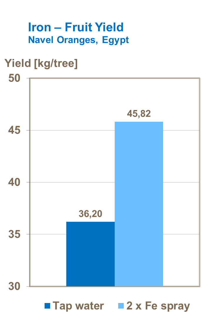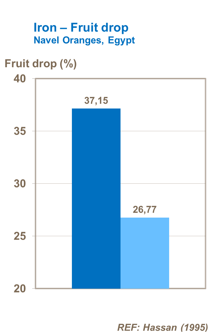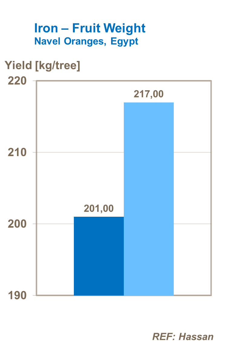 Iron also has a direct effect on crop quality improving the levels of total soluble solids in oranges and mandarins as well as increasing the TSS/Acidity ratio.