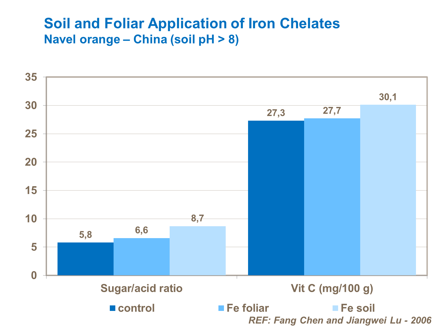 Trials with chelates (China, navel oranges) confirm that soil applications are more effective and provide bigger yield responses than foliar applications.