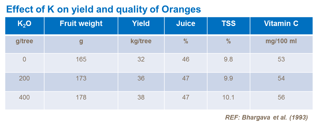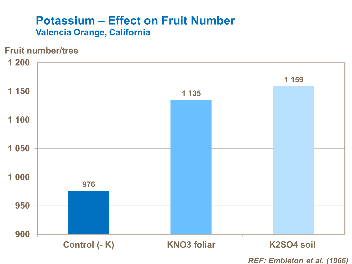 Trials with sweet oranges confirm the positive effect of K on yield, fruit size and quality. The improved yield is due, in part to improved fruit set but more commonly as a result of an increased fruit size.