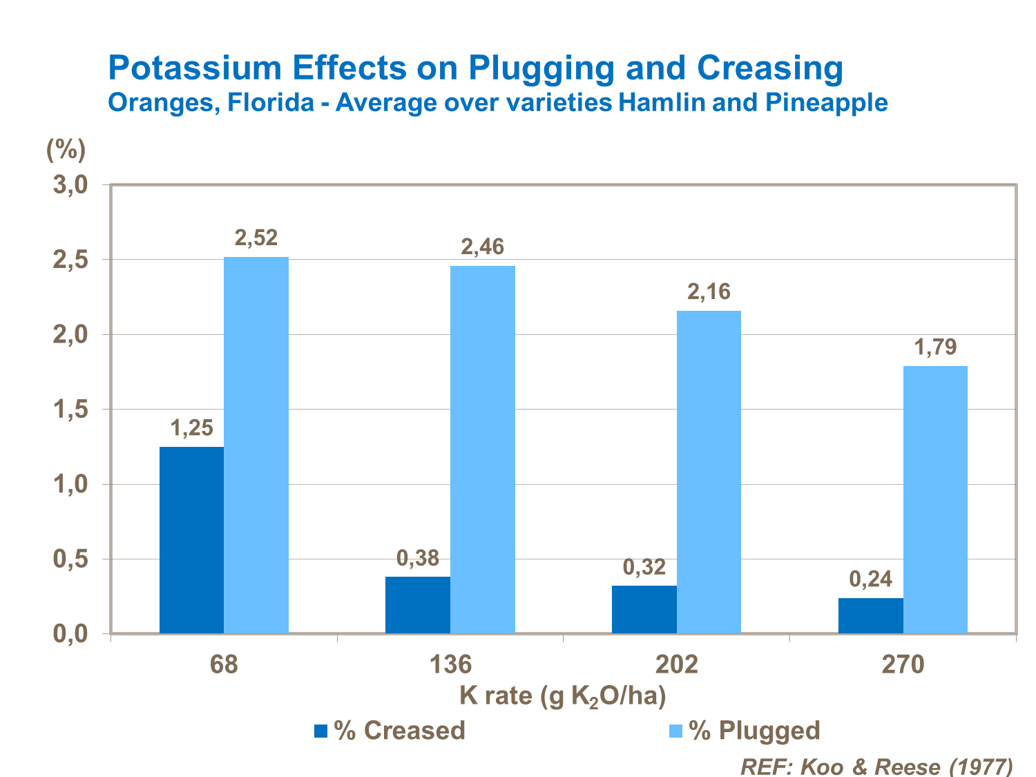 Some fruit disorders are likely to occur under low potassium conditions or high leaf N:K ratios, like plugging and creasing. These result in less marketable fruit.