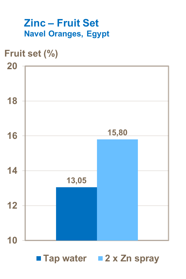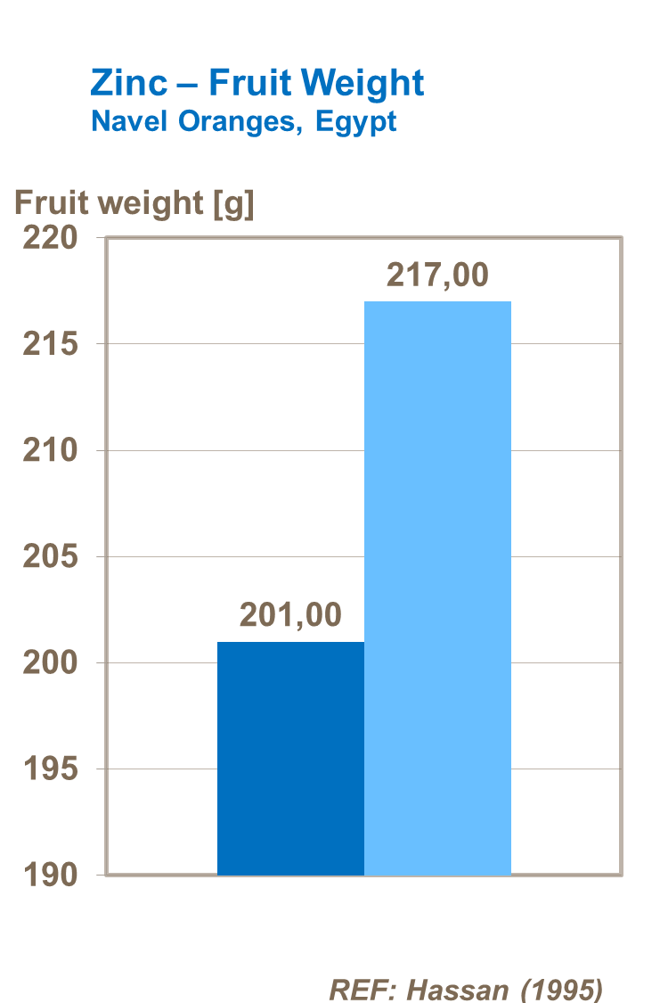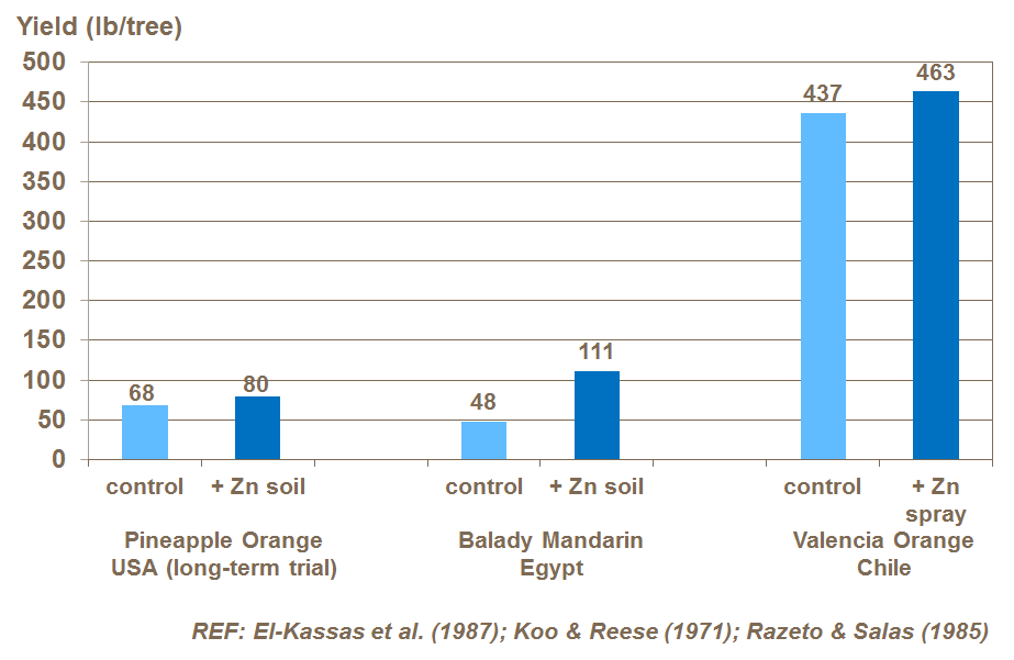 The main roles of zinc are as a cofactor of enzymes and involvement in the production of growth regulators responsible for internode elongation and chloroplast development. Zinc deficiency significantly reduces growth and yield potential. Low zinc levels reduce fruit number per tree and, to a lesser extent fruit size, resulting in decreased yields. Soil and foliar applications are both effective in increasing citrus production yield.