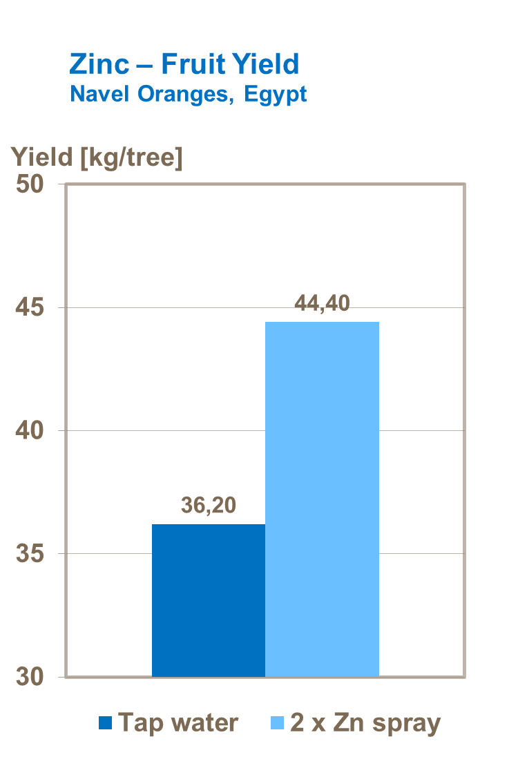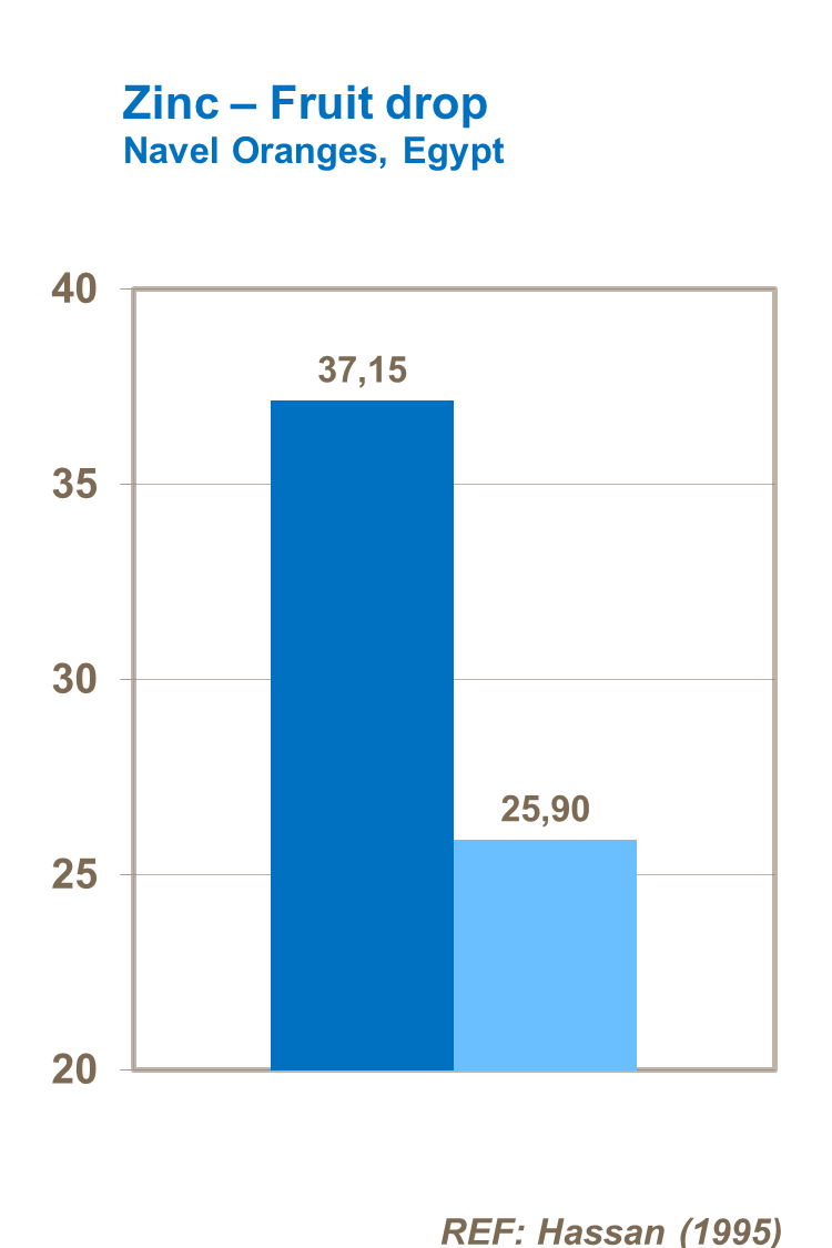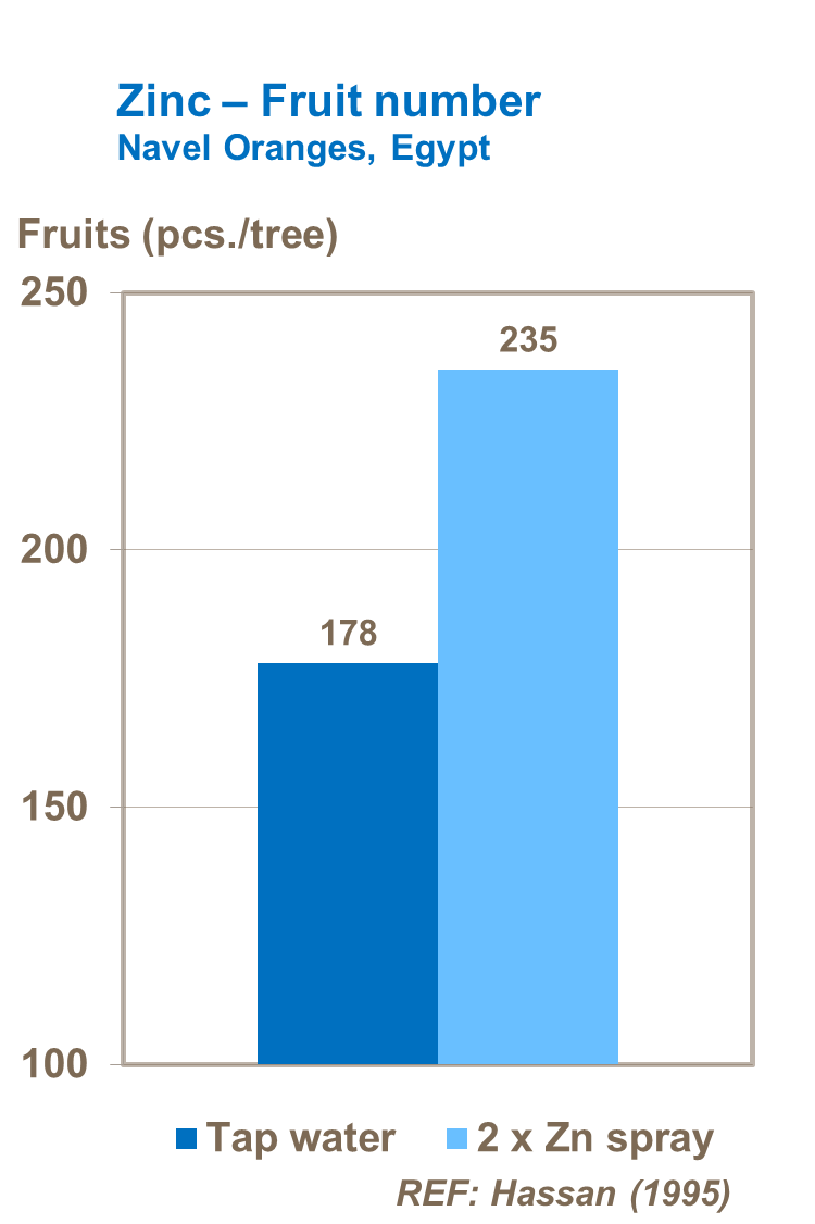 Zinc deficiency significantly reduces growth and yield potential. Low zinc levels reduce fruit number per tree, as trials with navel oranges in Egypt show.