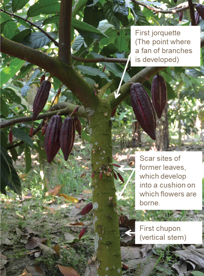 Nutrients for a flush of growth are drawn from the older leaves and stem. If soil fertility is low, flush growth can cause major defoliation of the tree. The extent of this defoliation is often used as a guide to the soil’s fertility status. Generally, 8 to 10 healthy leaves are required for the development of one pod. Typically, the cocoa tree develops a vertical stem known as a chupon and forms 3 to 5 more horizontal exposed branches called jorquettes or fans. Leaves form at the growing end of the chupon and on the fan branches. Leaves on fan branches grow alternatively in series of groups known as flushes.