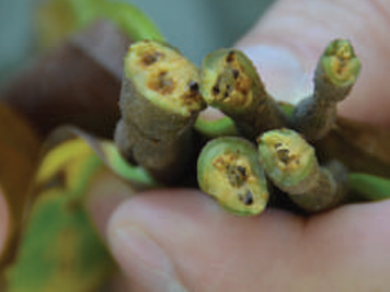 Witches’ Broom caused by the fungi Marasmius and Moniliophthora perniciosa has in the past devastated production throughout all of South America, Panama and the Caribbean. The main symptoms are thick ‘brooms’ – lateral shoots - which grow from infected buds leading to malformed pods which usually die young.
