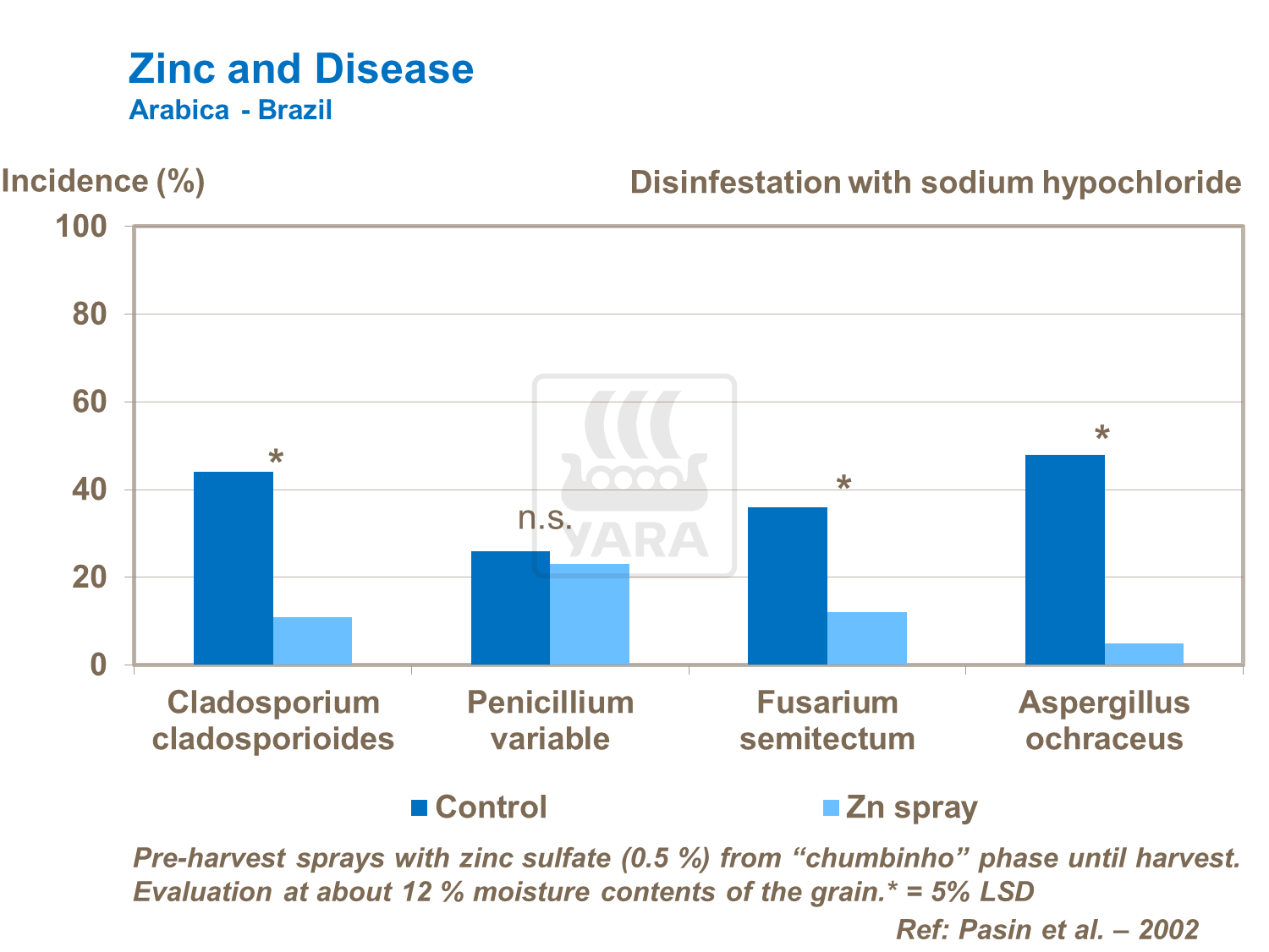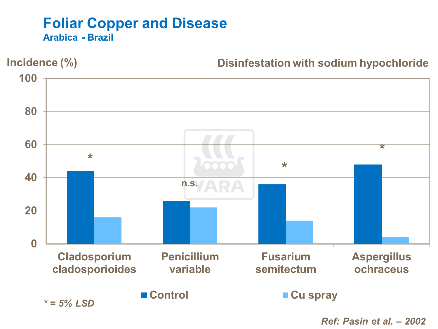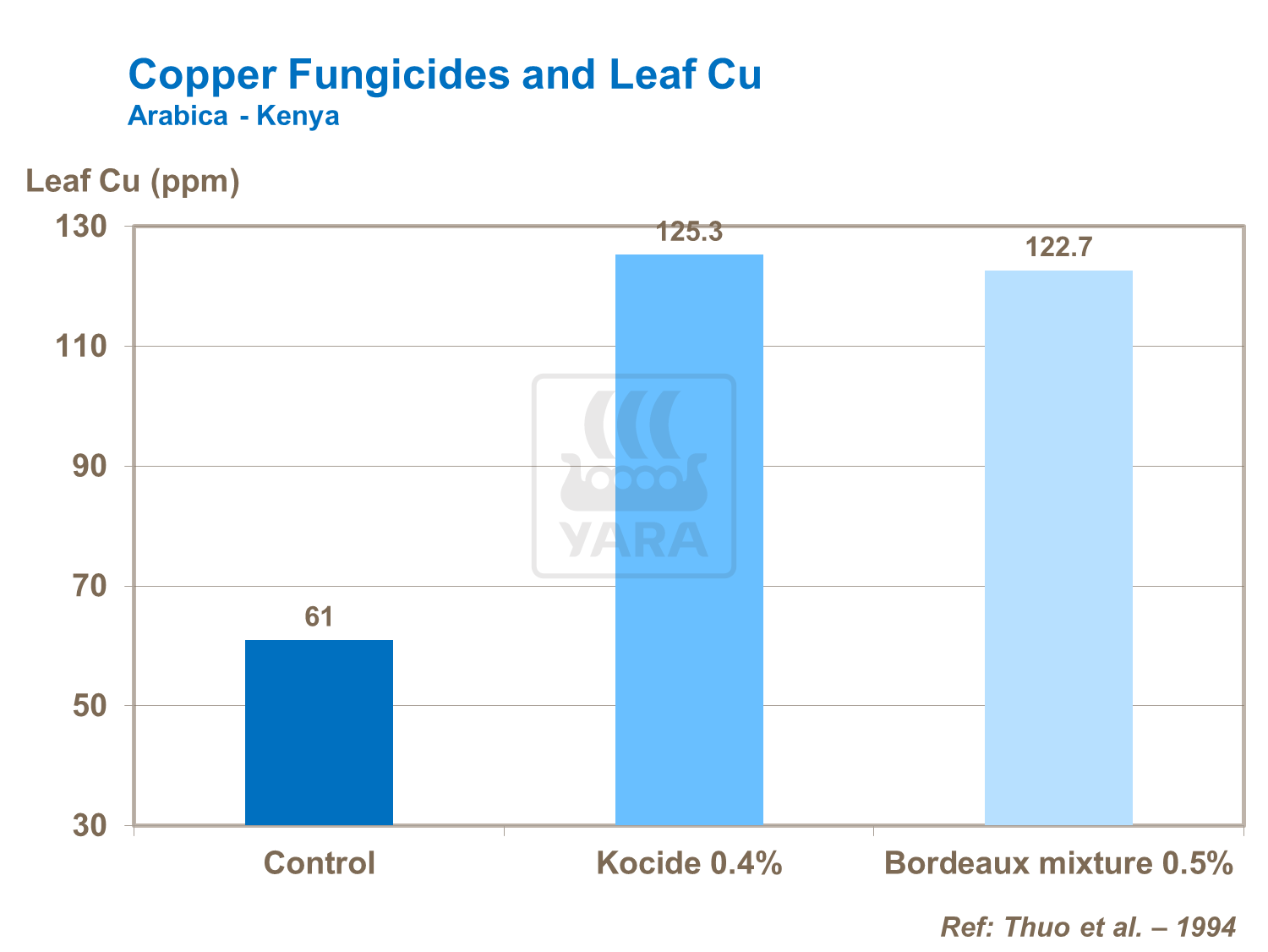 The widespread use of copper based fungicides means that copper deficiencies are rarely seen. Trials show that copper fungicides can supply amounts of copper at levels well above the 20-25ppm copper considered optimum for coffee production. One of the key benefits of a regular spray application program is the reduced incidence of fungal diseases in processed coffee grains.