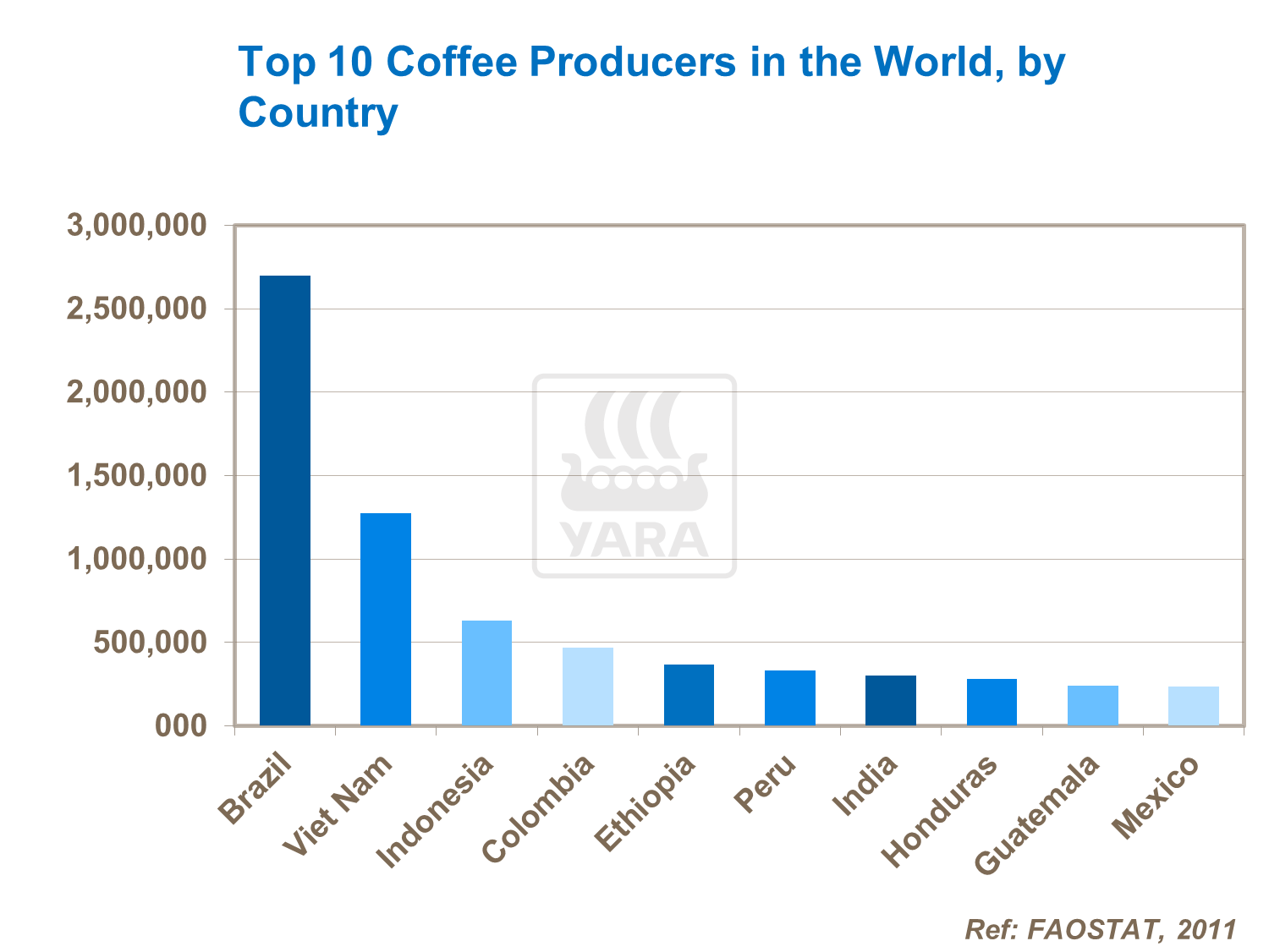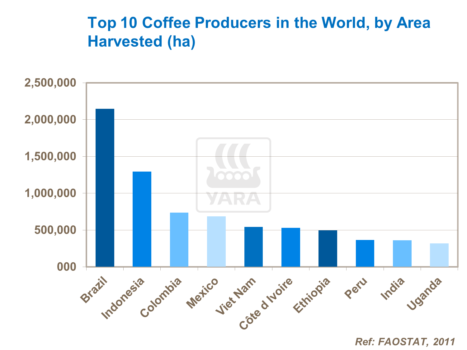 Most coffee – around 85% of the world’s total - is produced in South and Central America. Around 85% of this is “Arabica”. Of the remaining total, 10% is now produced in Asia and 5% Africa. In these regions, “Robusta” is more widespread. Biggest single producer is Brazil with 2.2 million tonnes across 2.3 million ha. Vietnam, Indonesia and Colombia are the next largest, producing between 0.6 – 1.0 million tonnes each across a total combined area of 2.6 million ha.