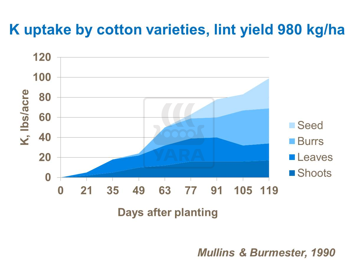 Potassium increases the outward translocation of photosynthate from the leaf. In cotton, K plays a particularly important role in fiber development. Potassium affects the fiber quality, the micronaire, length and strength, it reduces the incidence and severity of wilt diseases and increases water use efficiency. The bolls are major sinks for K, and the uptake may reach 3,2 kg/ha a day during the intense part of boll development. About 70% of total K uptake occurs after the first bloom.