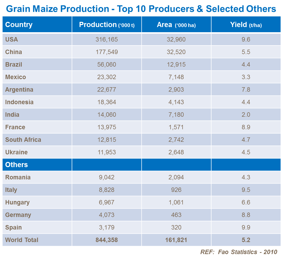 Around 40% of the US crop – 130 million tonnes - is processed for cornethanol. 1 tonne of maize produces around 4-500 liters of bio-ethanol. Two basic processes are employed: