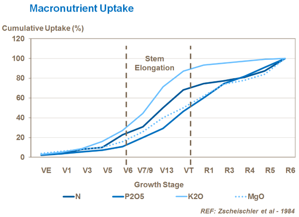 While the main period of nutrient uptake in maize is during stem extension or shooting (V6 to tasseling) unless centre pivot fertigation is practiced, fertilizer needs to be applied before this because crop height and density means it is difficult to enter the field with conventional machinery after this time.