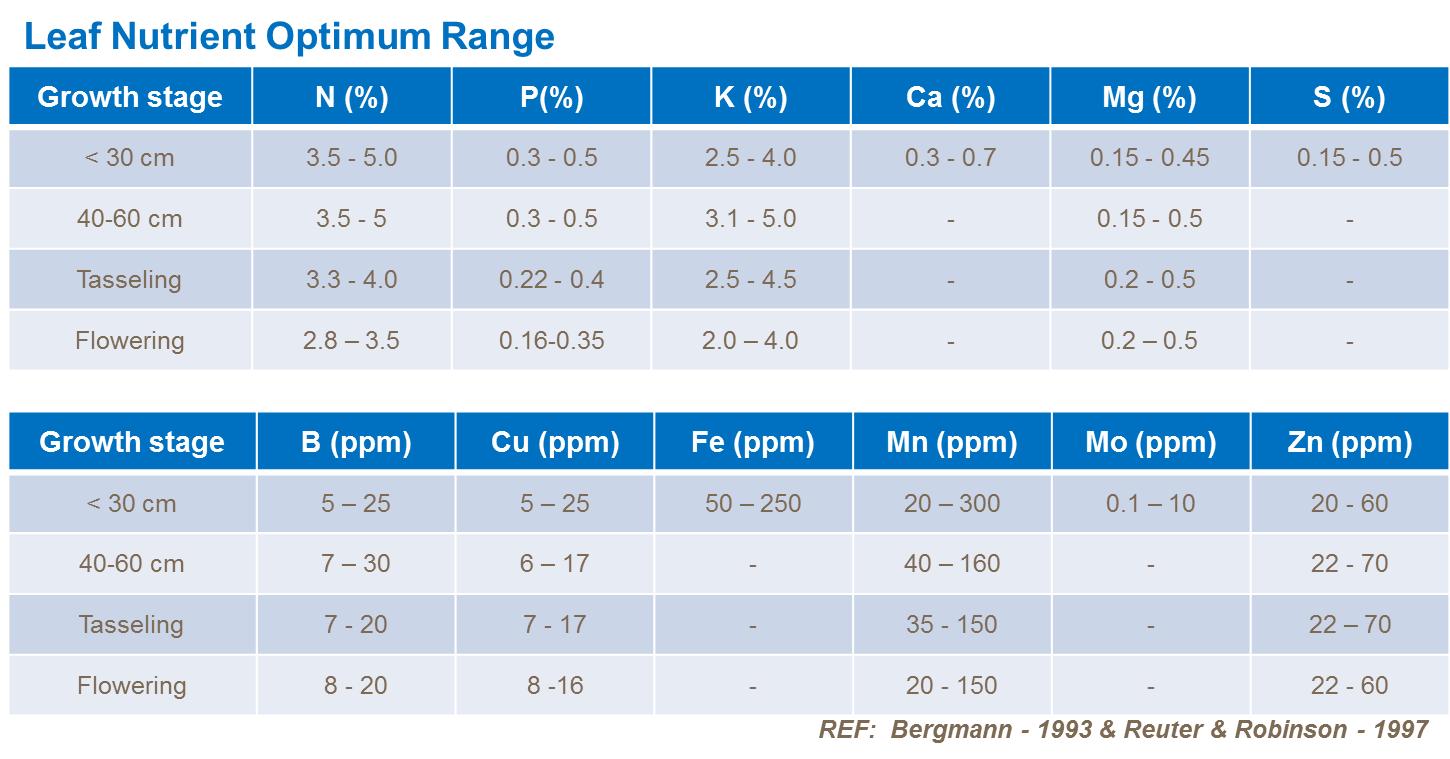 • From tasseling to silk stage, take the leaf opposite and below the ear, again collecting from 20–25 plants Table 8 gives interpretative nutrient ranges across a range of growth stages up to flowering: These figures are guidelines and could vary according to variety as well as local research.