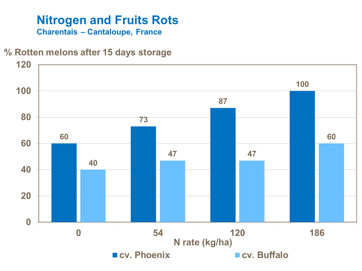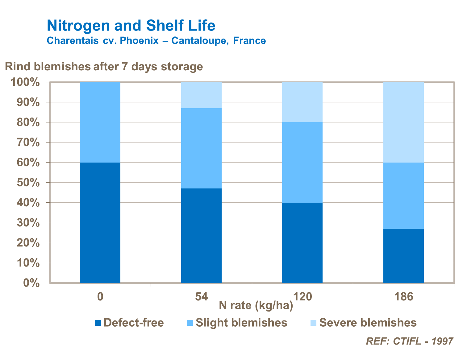 Too much nitrogen at later stages of growth can spoil fruit quality by increasing the level of blemish on the rind and encouraging fruit rot. Thus, it is important to confirm rates and timing following local trials that take into account the need for high yield, but also good quality fruit.