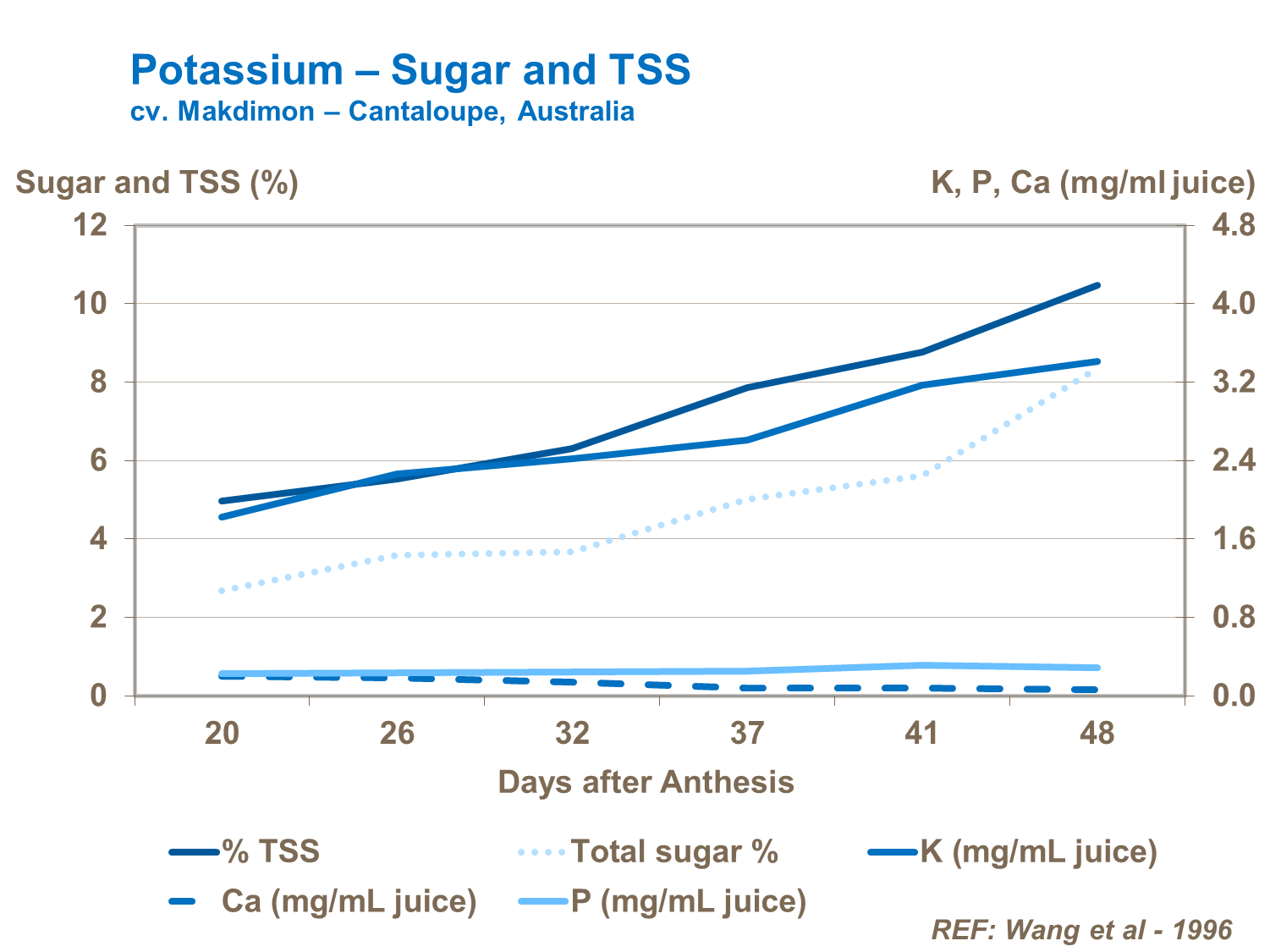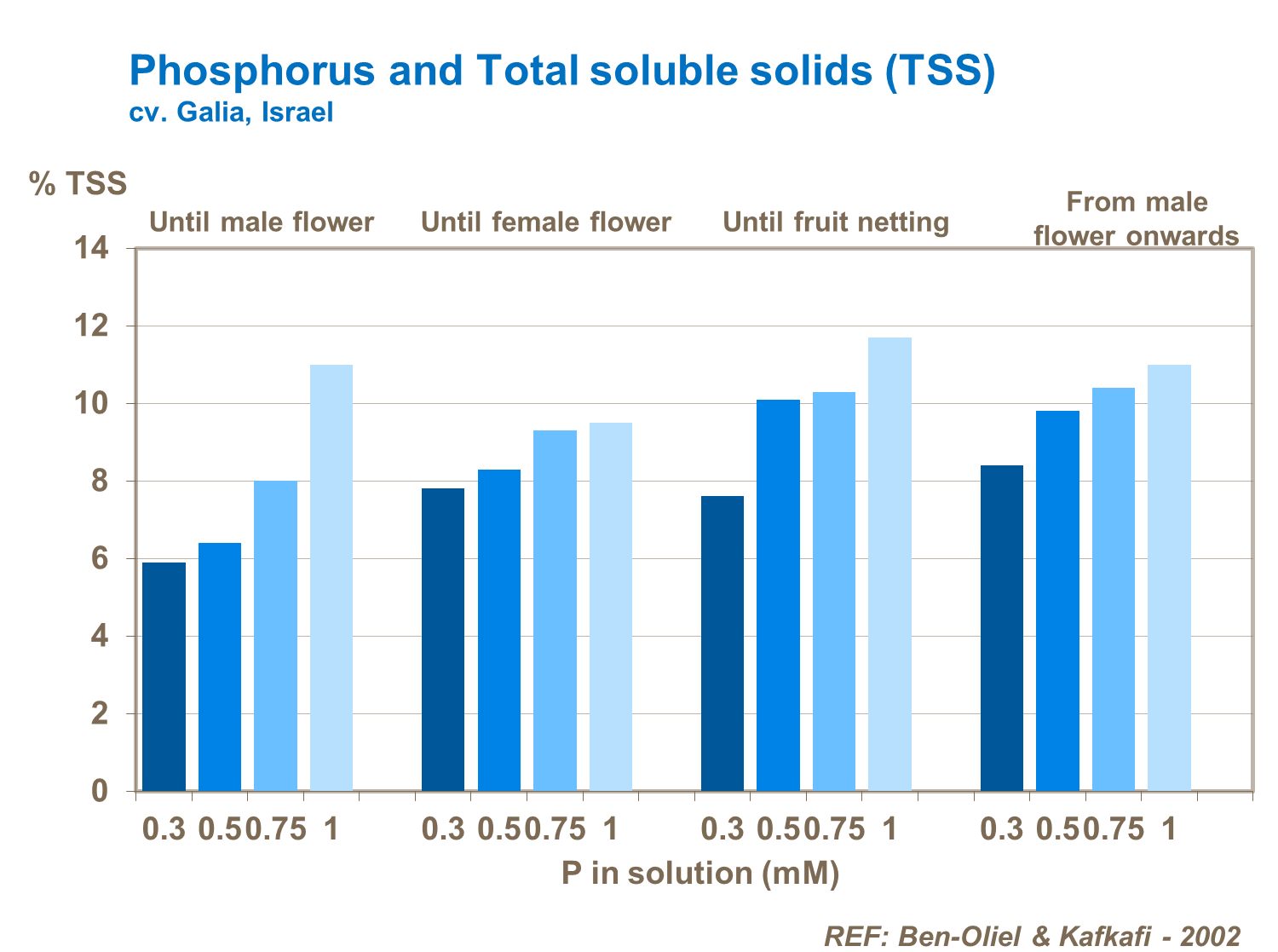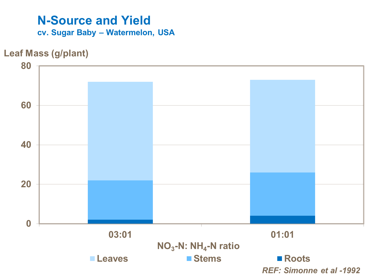 Right amount of nitrogen supply is important to boost leaf growth and sugar synthesis, improving fruit quality. Nitrogen form is particularly important and it is critical to maintain a good balance between ammonium and nitrate forms to maintain fast growth and good crop productivity. Trials confirm significant reductions in nitrogen uptake by leaves and yield losses from use of nitrogen-fertilizers with too high a proportion of ammonium compared to nitrate. Crop quality also deteriorates.