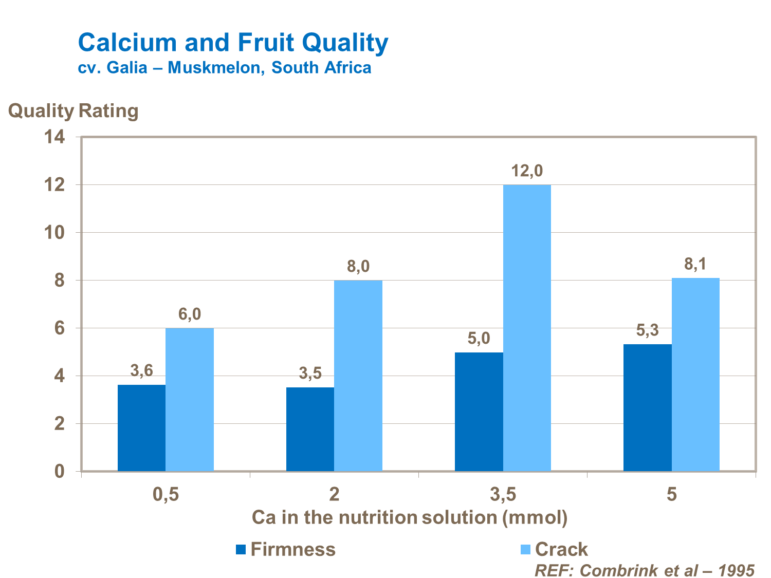 Poor calcium nutrition results in a wide range of fruit quality problems, such as lack of firmness (cv. Galia - Muskmelon, South Africa). High levels of calcium thicken cell walls and firm the fruit. However, calcium needs to be balanced with adequate supplies of boron to prevent cracking.