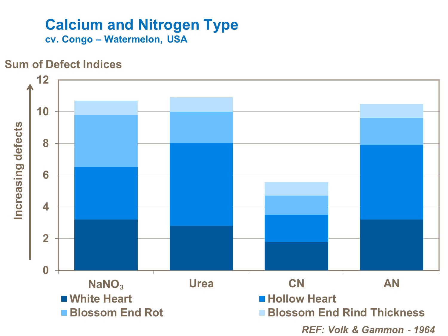 Fertilizer formulation also has a significant effect on quality characteristics and fruit disorders. Trials confirm that calcium nitrate is particularly effective at ensuring good fruit quality (cv. Congo - Watermelon, USA). This is largely because ammonium based fertilizers are antagonistic to calcium uptake. They also reduce soil pH and slow water uptake.