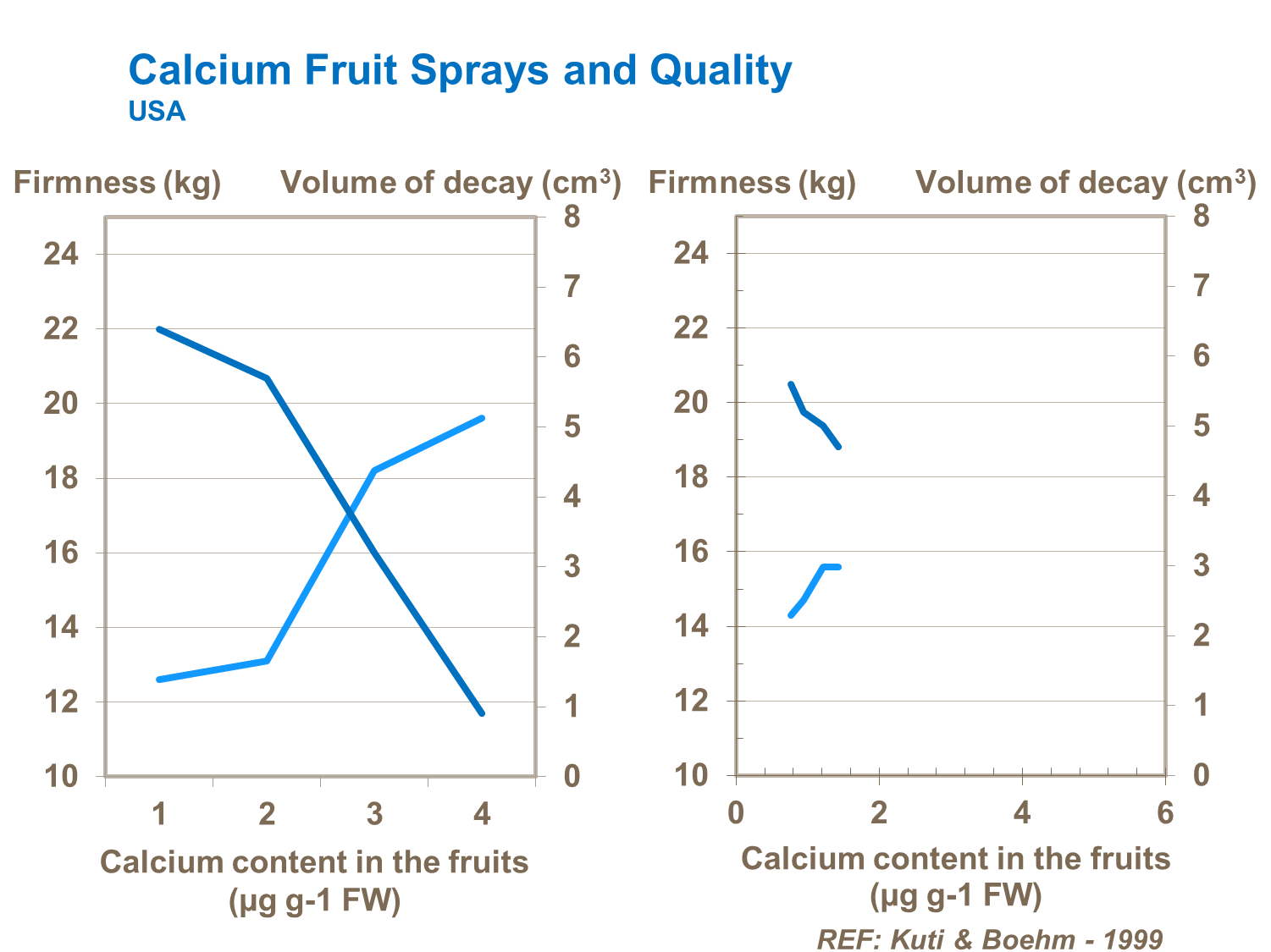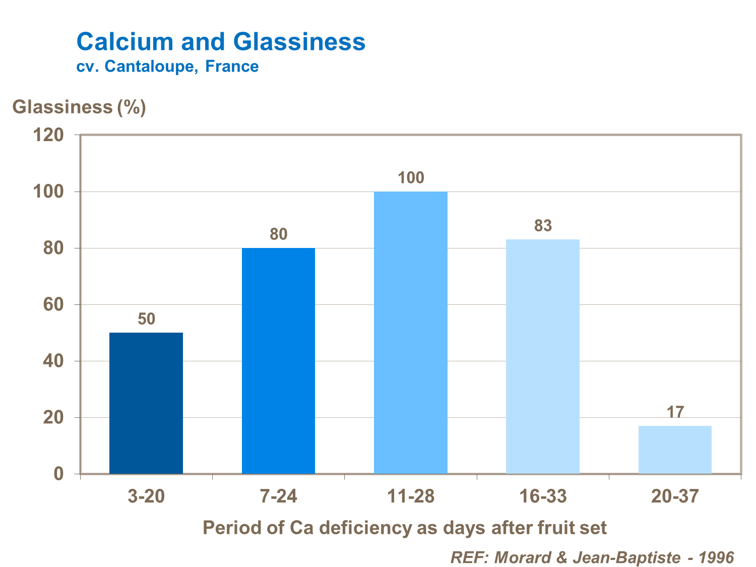 Low calcium supply can induce an early softening, or glassiness appearance of fruits, while the fruit is still immature (cv. Cantaloupe, France). As with all other calcium related fruit disorders, it is important to ensure calcium is available in the fruit right from fruit-set and particularly during early fruit-fill.