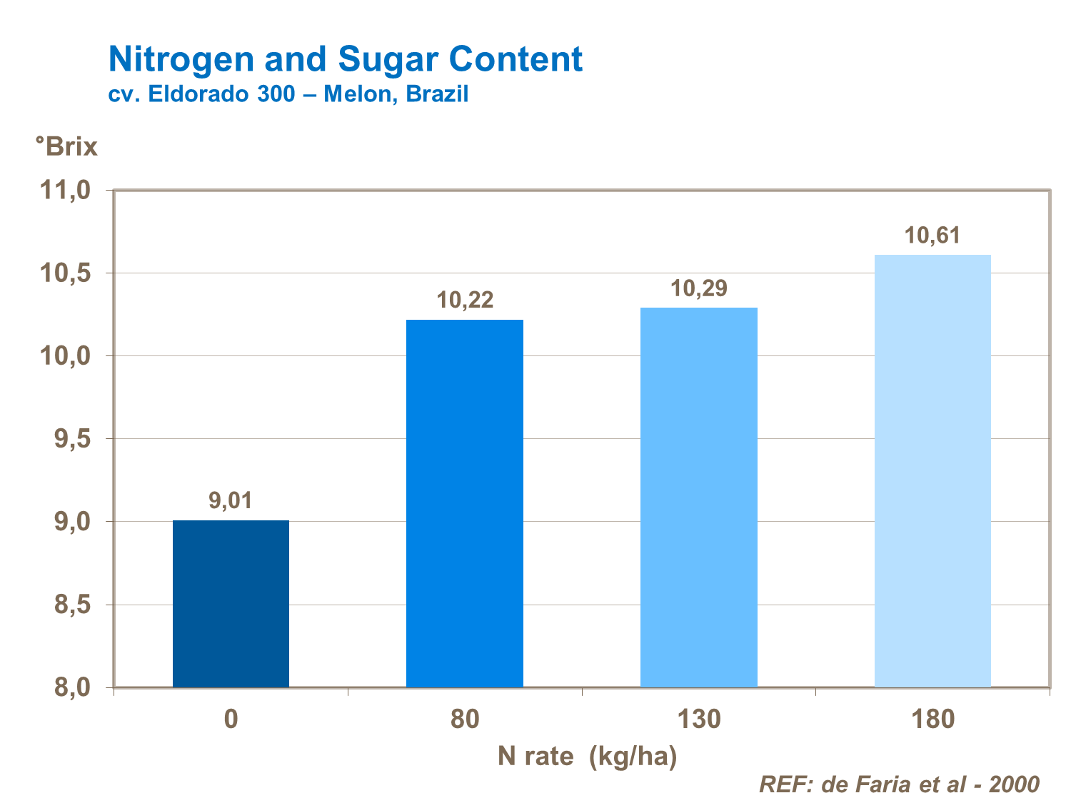 High nitrogen rates of this magnitude will also boost leaf growth and sugar synthesis, improving fruit quality (cv. Eldorado 300 - Melon, Brazil).