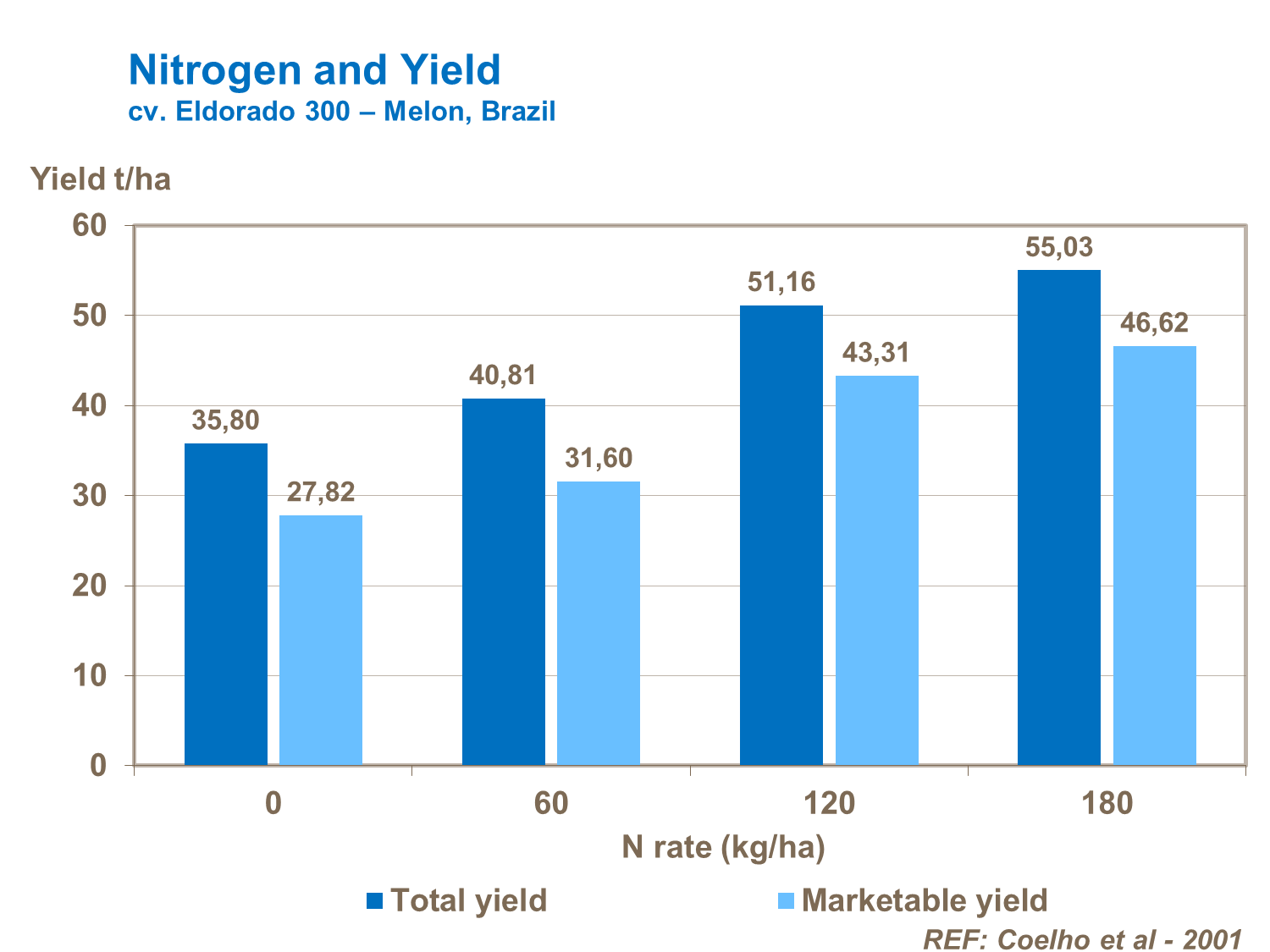 Crops remove around 3.8 kg for every ton of fruit produced. Rates of 180 kg/ha can supply 50t/ha field yields (cv. Eldorado 300 - Melon, Brazil).