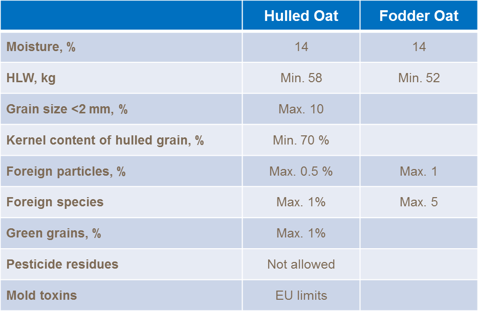 Hulled oats must be fully ripened when harvested, threshed and dried carefully, free of mould and toxins, and healthy in terms of colour and taste. The quality requirements of fodder oats include appropriate humidity, sufficient weight per hectoliter and purity from foreign particles. The oat must meet the maximum limits set for mould toxins by the EU. Oats must not contain pesticide residues.