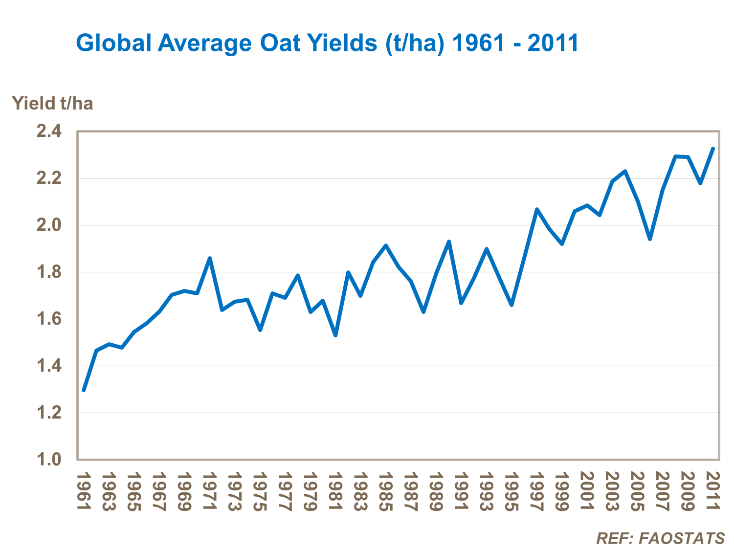 The effect of this reduced area has not had the same dramatic effect on production due to the improvement in yields across the world that has happened over this same time. The average world yield (t/ha) has increased by 79% since 1961.