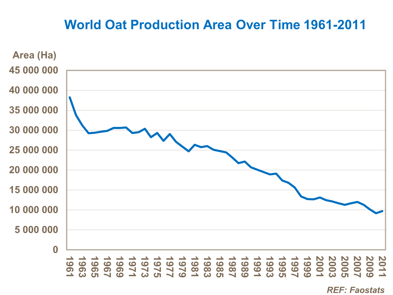 The annual global production of oats is about 22.5 million tons harvested off 9.7 million hectares. World oat production has decreased over the last few decades, and is now at 45% of the 1961 production figure.