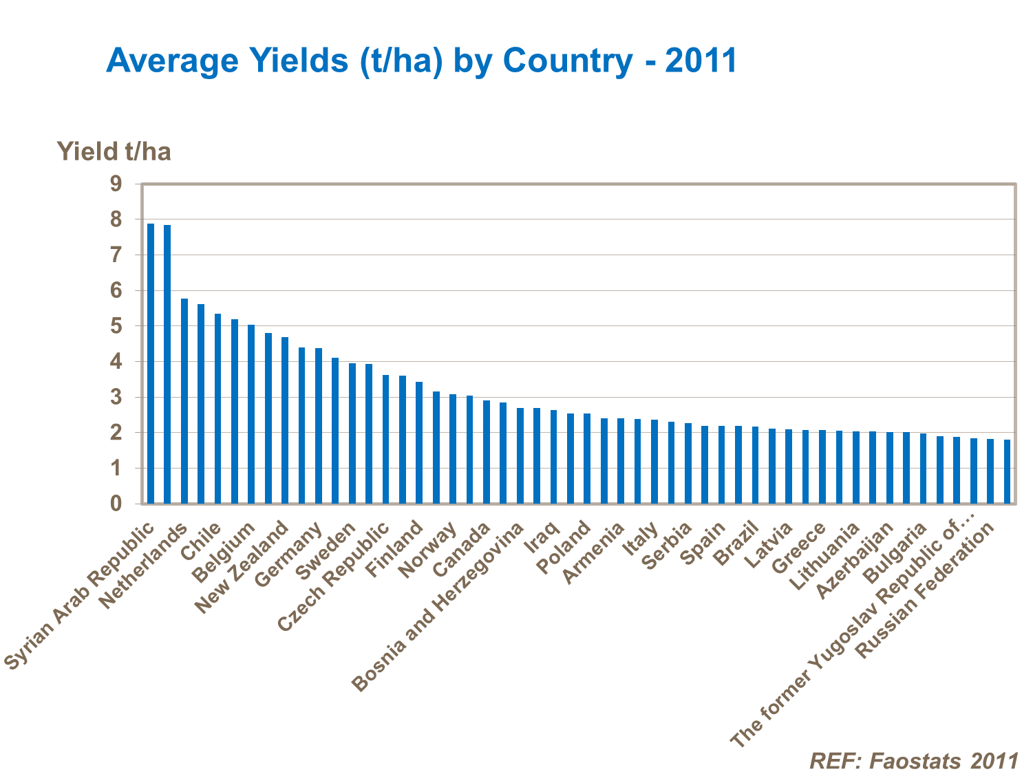 With the average yield globally being 2.3 t/ha, this masks the variation between countries which varies from 0.7 to over 7.0 t/ha.