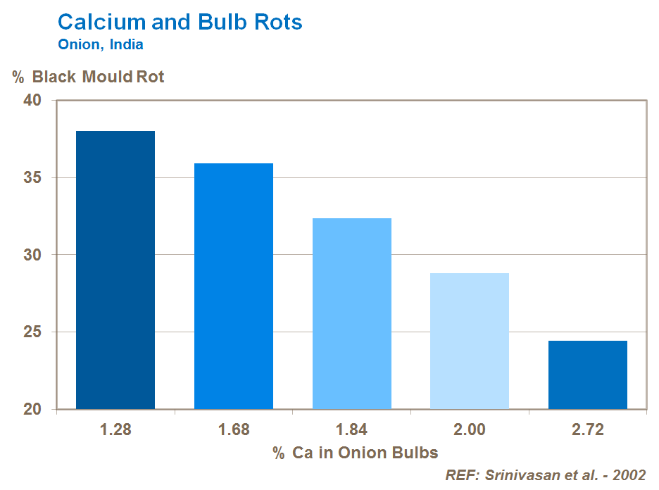 Calcium is particularly important for bulb density, integrity and long-term storage with minimal disease problems. Calcium has a major role to play in promoting long-term storage quality with minimal diseases problems. Trials confirm that onion crops with high levels of calcium in the bulbs have reduced levels of black rot due to Aspergillus niger and also less neck rots such as Botrytis allii.