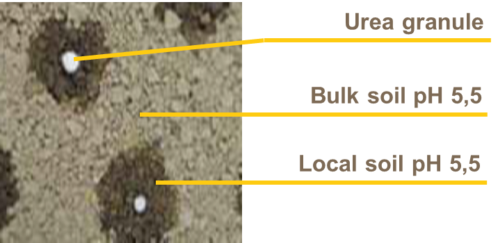 The ammonium generated by hydrolysis does not, however, behave exactly as the ammonium from ammonium nitrate. Hydrolysis of urea results in a short-term alkalization in the immediate vicinity of the urea grain applied. It shifts the natural balance between NH4+ and NH3 to the latter form, resulting in volatilization losses.