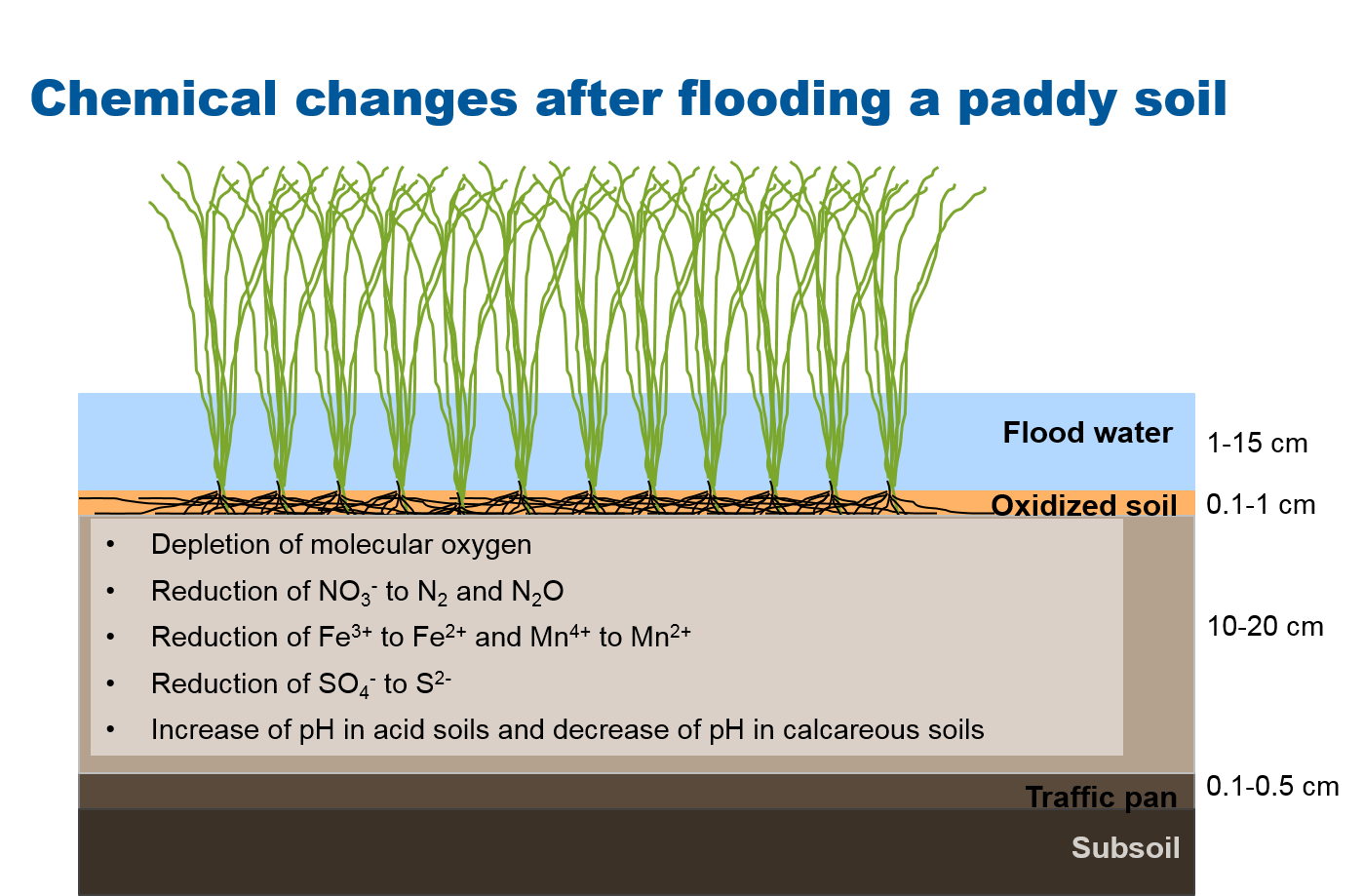 | Fe | Fe3+ oxides are reduced to plant-available Fe2+ |