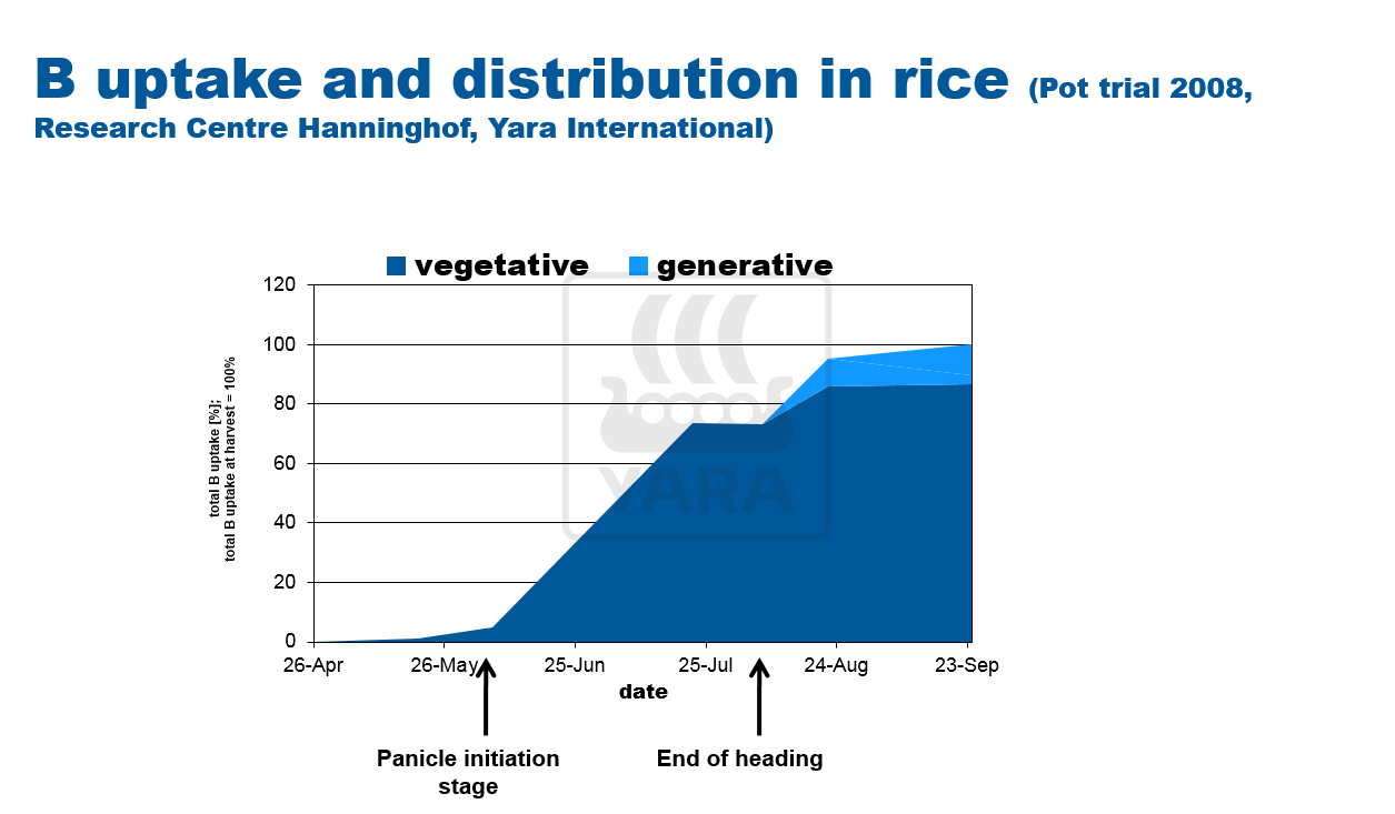 Boron (B) is not re-translocated, i.e. all boron found in the grain has to be available during the reproductive stage.