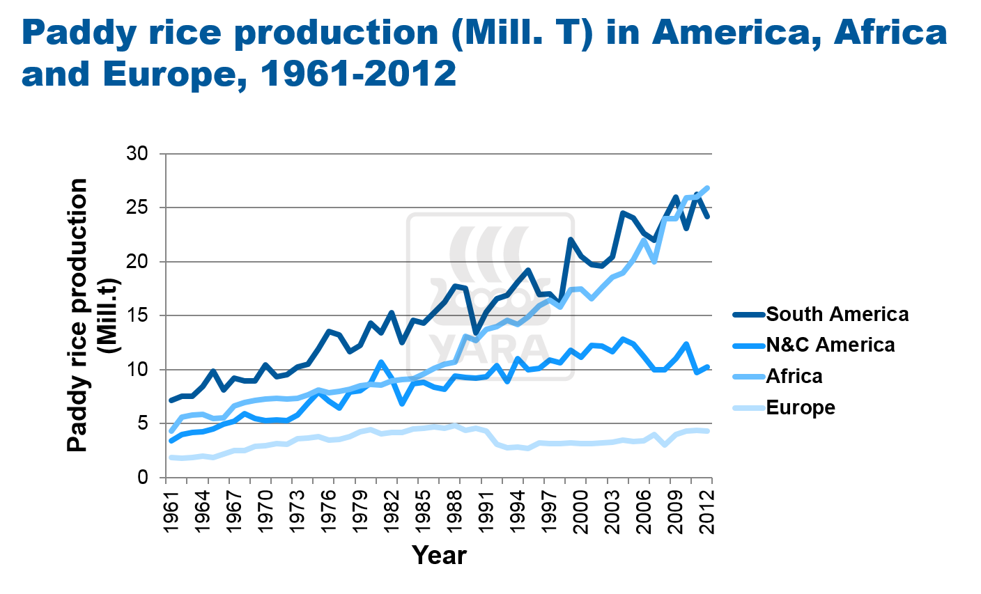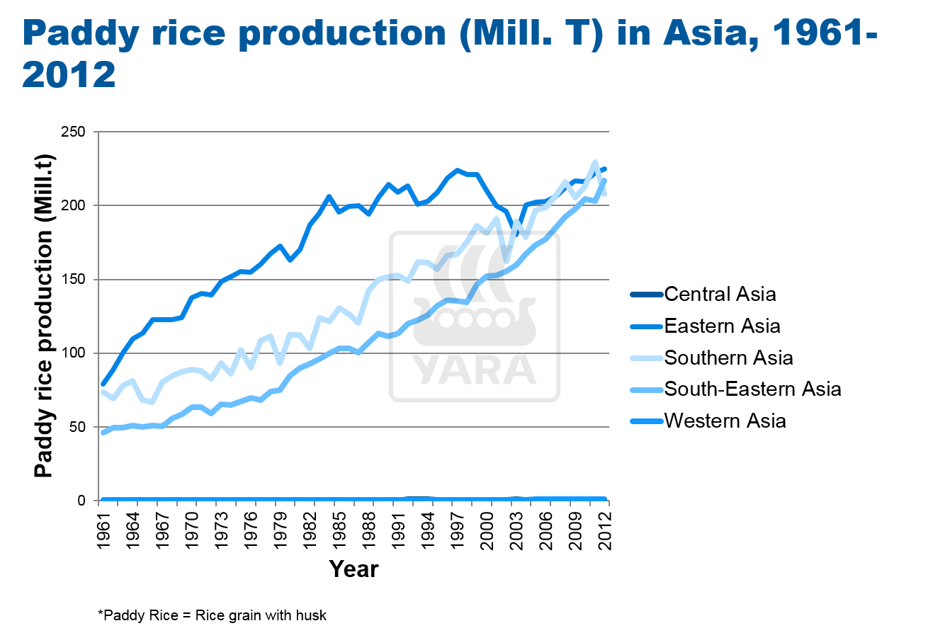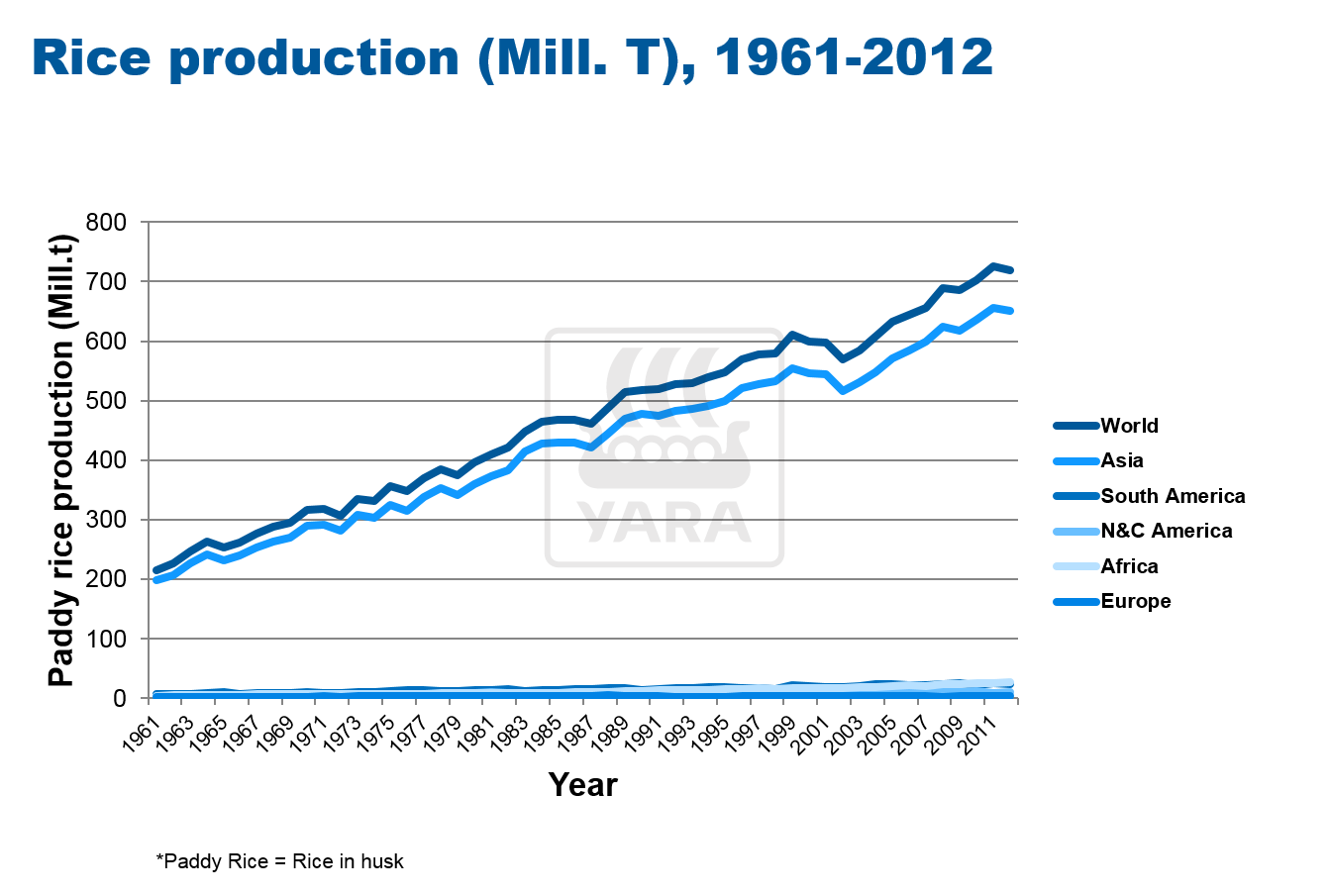 During the last 20 years there was a steady increase of rice production in South America (mainly Brazil =11 Mill. t) and Africa (mainly Egypt = 5.9, Madagascar = 4 and Nigeria = 4.8 Mill.t) (Data 2012).