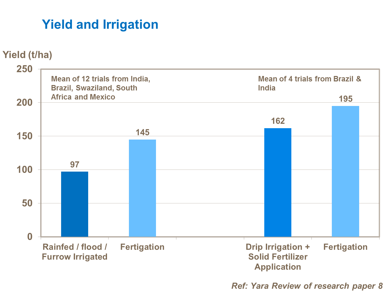 While only around 1% of the cane crop is currently fertigated worldwide, this practice offers great potential to maximize sugarcane yields and crop margins. Compared to rain-fed or other forms of irrigation, fertigation of sugarcane has a marked effect on sugarcane yield (Figure 9). It is often a more efficient means of applying fertilizer than solid application.