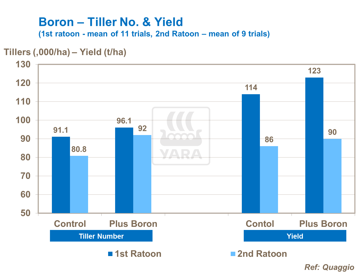 Boron has a direct effect on new root and shoot development. Some of the strongest effects from boron have been seen from applications to the furrow alongside the plant crop where the element improved early shoot growth and tillering leading to higher sugar yields.