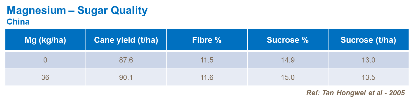 Sugar is also influenced by magnesium supply and sucrose content is reduced where Mg nutrition is inadequate
