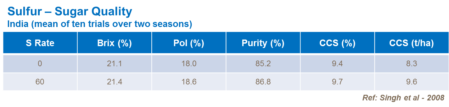 Sulfur must be applied if sugar yields are to be maintained in the sugarcane crop. Research confirms that sulfur has an effect on a range of characteristics that influence sugar quality, including Brix, Pol, juice purity and CCS.
