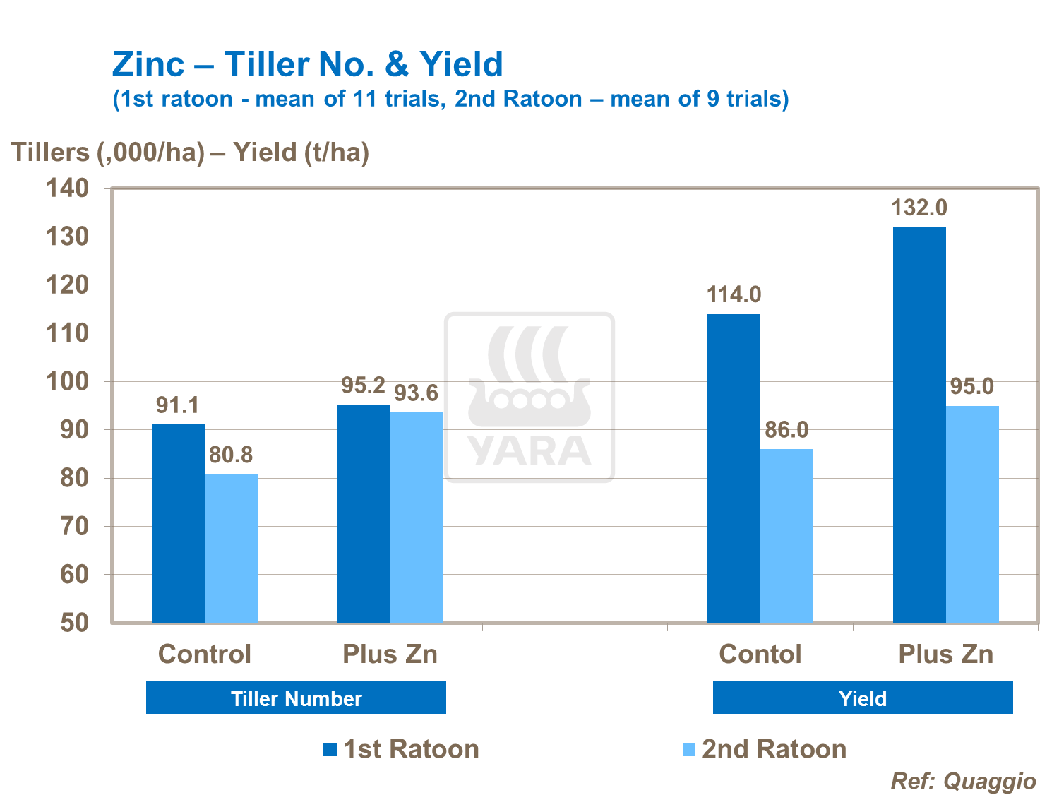 Of all the micronutrients, zinc provides the largest response in the greatest number of trials. Peak demand of zinc is during establishment and tillering, hence the strong responses seen to zinc applied impregnated on the set or directly applied to the furrow. However, high yield responses also come from foliar zinc applied to the leaf on each subsequent ratoon crop. This is largely due to its effect on early root and shoot growth and the subsequent increase in tiller numbers leading to significant yield increases in the plant and following ratoon crops. Best effects are seen where zinc is applied alongside boron.