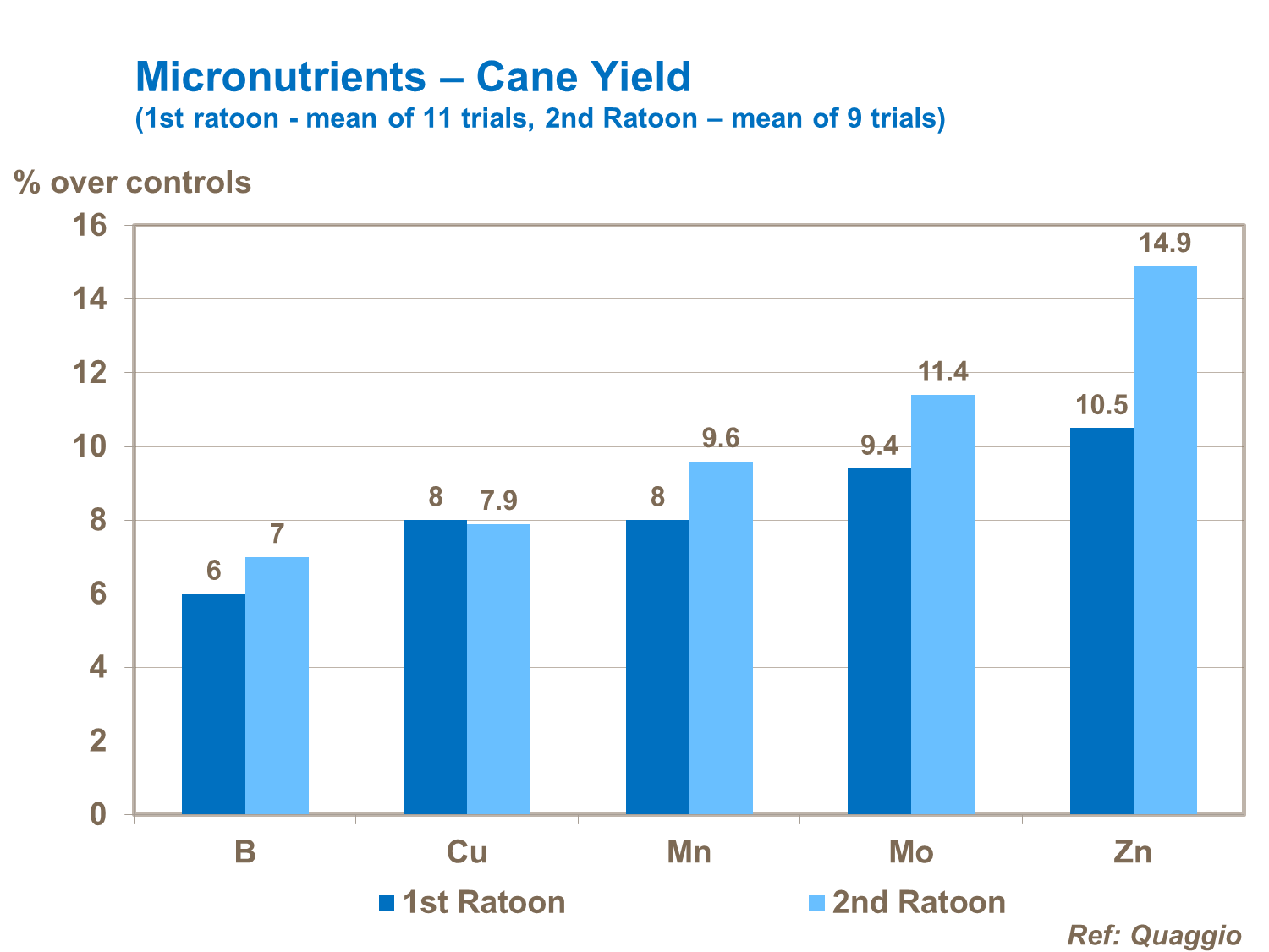 Micronutrients play an important role in increasing sugarcane yield and producing quality crops. Deficiencies and responses are related to a wide range of factors most notably soil type, pH and availability. Responses can be high in both the plant and the ratoon crop where foliar application helps encourage better growth. Plant crops – while higher yielding – usually have a greater soil supply of micronutrients.
