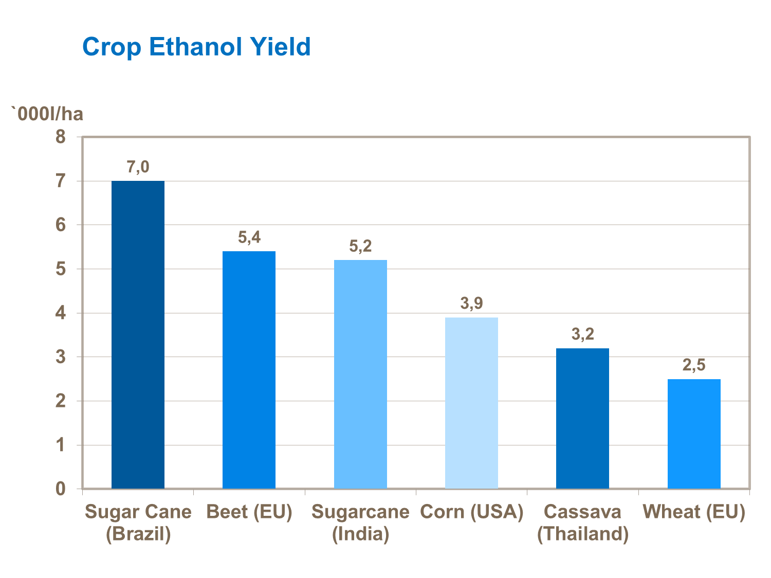 Brazil has achieved very high levels of ethanol productivity from sugarcane with around 7000 liters of ethanol produced/ ha and 6.1 MWhr of energy/ha. A typical sugarcane mill in Brazil crushes 2 million tons of cane from 30,000ha of farmed land and produces 200 million liters of ethanol a year.