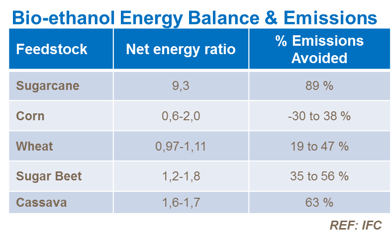 In comparison to ethanol from maize, wheat, sugar beet or sorghum, sugarcane produced ethanol has a higher net energy ratio and a lower level of CO2 emissions.