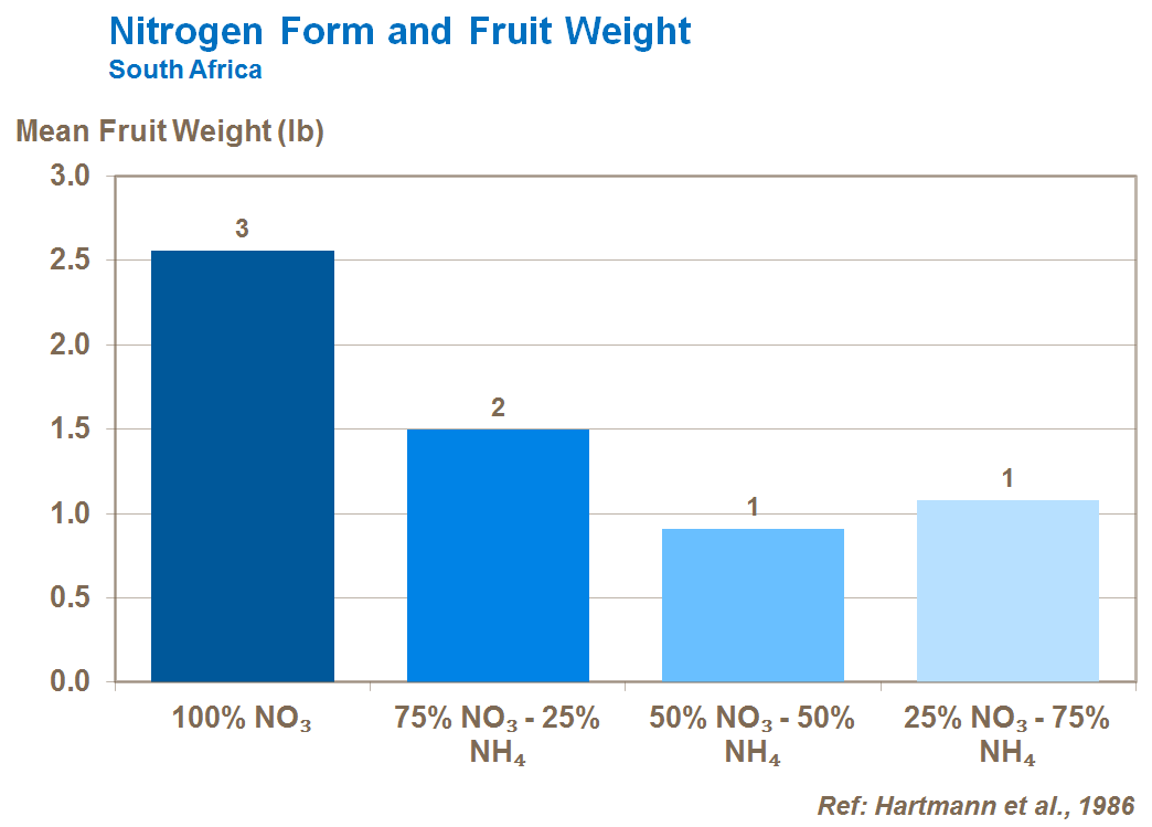 Nitrogen form is particularly important in the tomato crop. It is critical to maintain a good balance between ammonium and nitrate forms to maintain fast growth and crop productivity. Over-use of ammonium N can cause problems. Trials confirm significant tomato yield losses of up to one third from use of ammonium in preference to nitrate.