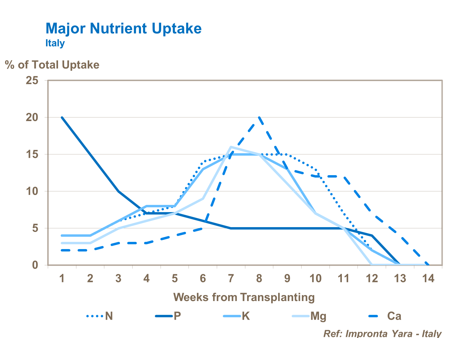While most phosphorus is required early on, nitrogen's peak requirement is just before flowering. Most calcium needs are from flowering through fruit development and up to harvest.