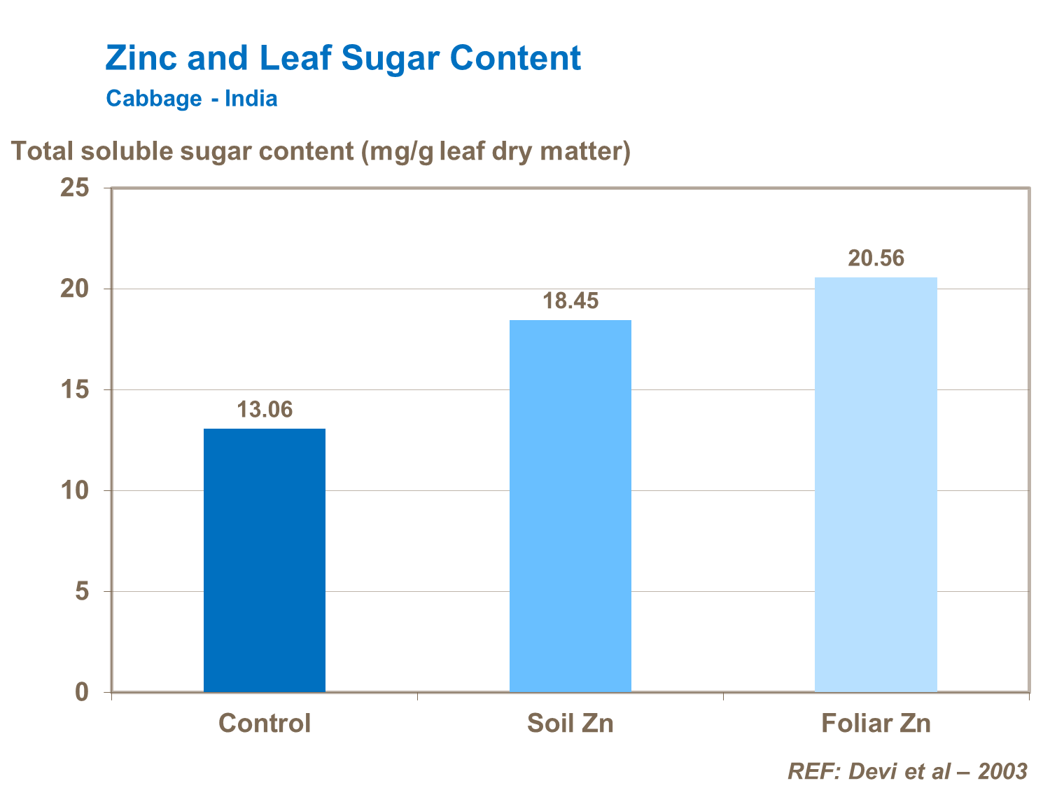Molybdenum and zinc also increase sugars contents. When available in sufficient quantities, zinc increases the sugar content of leaves. Zinc forms stable complexes with proteins and is therefore a structural and functional element of many enzymes. Excessive use of phosphorus can restrict zinc uptake. Thus it is important that zinc and phosphorus is balanced.