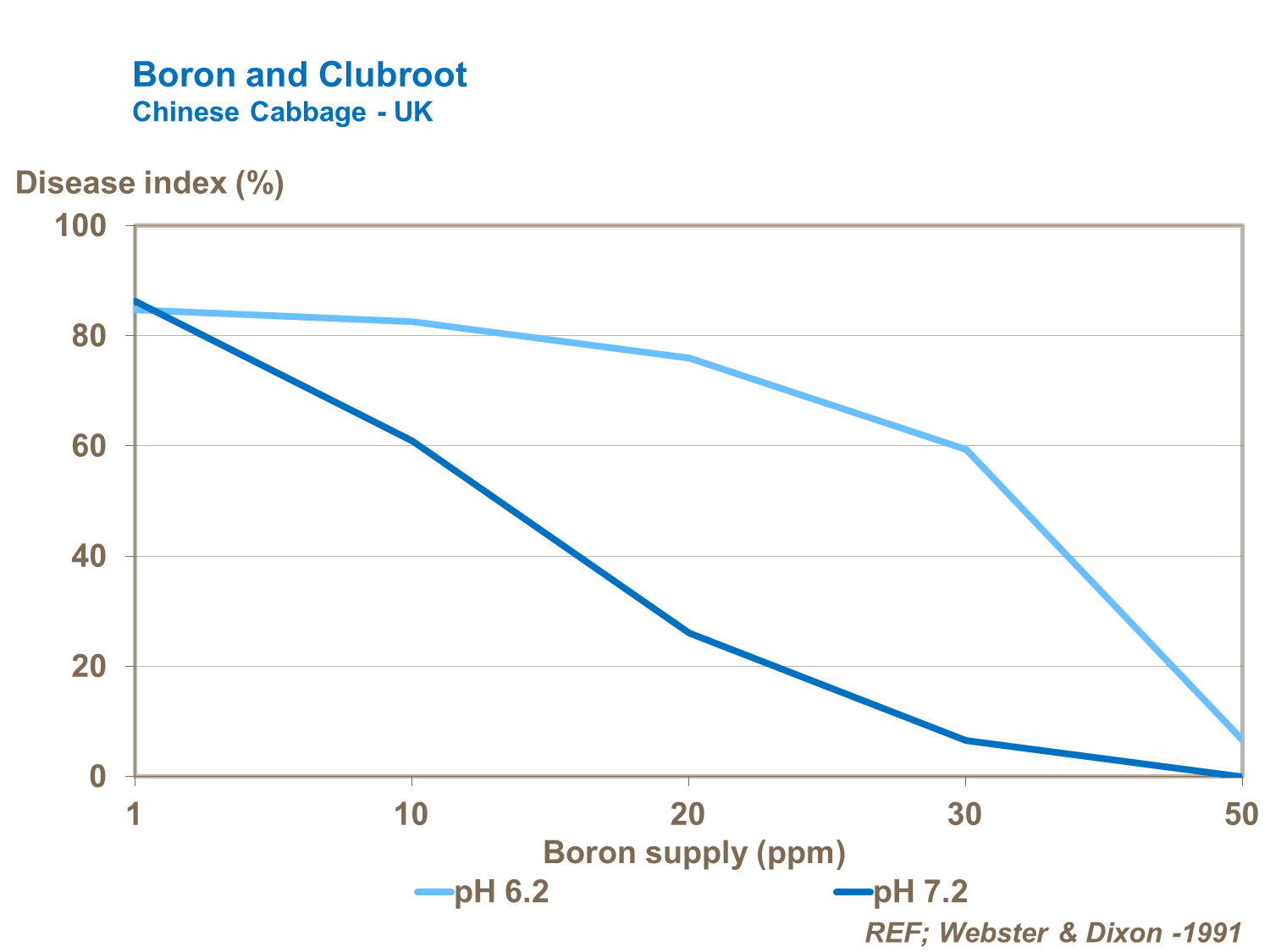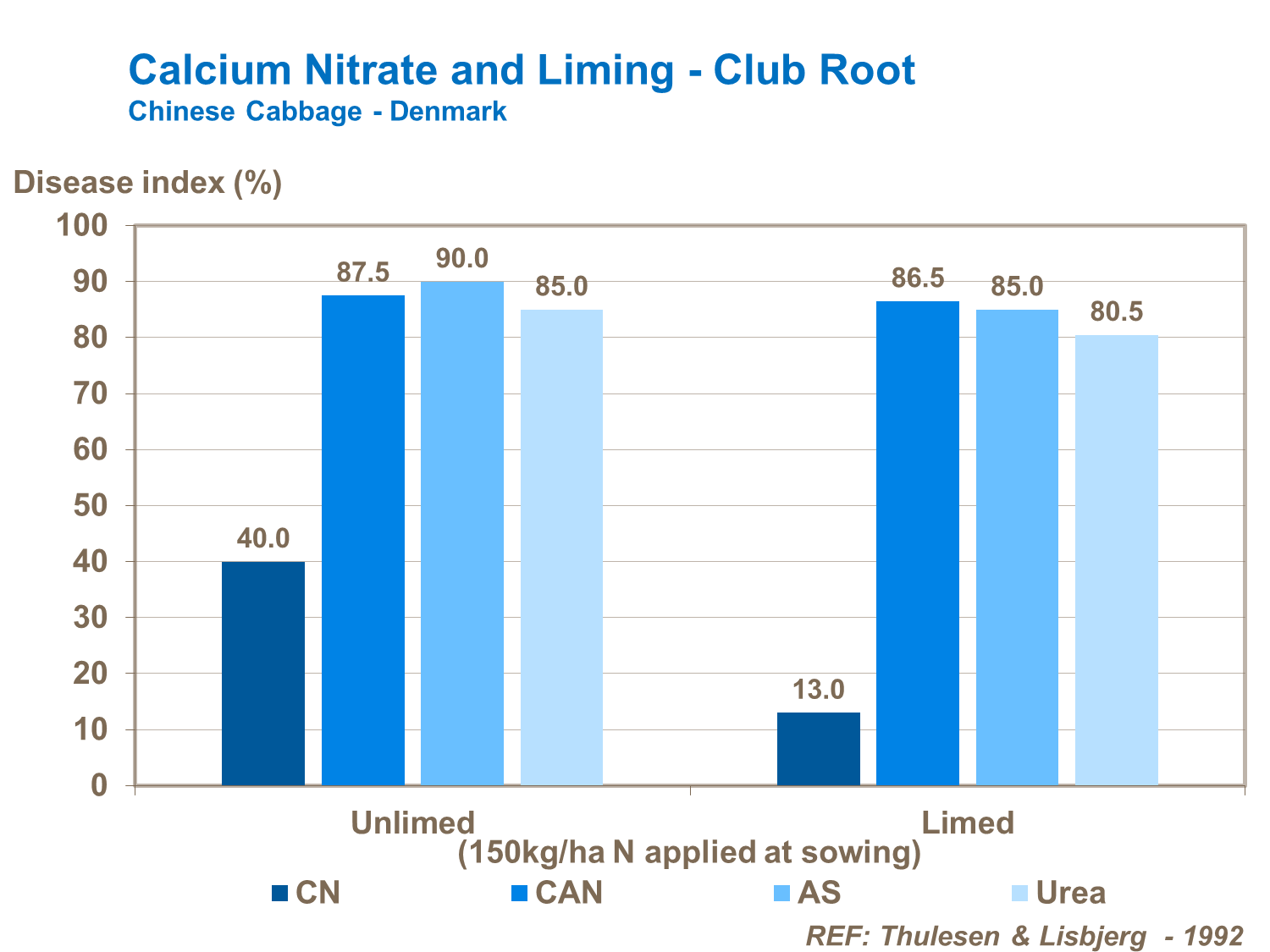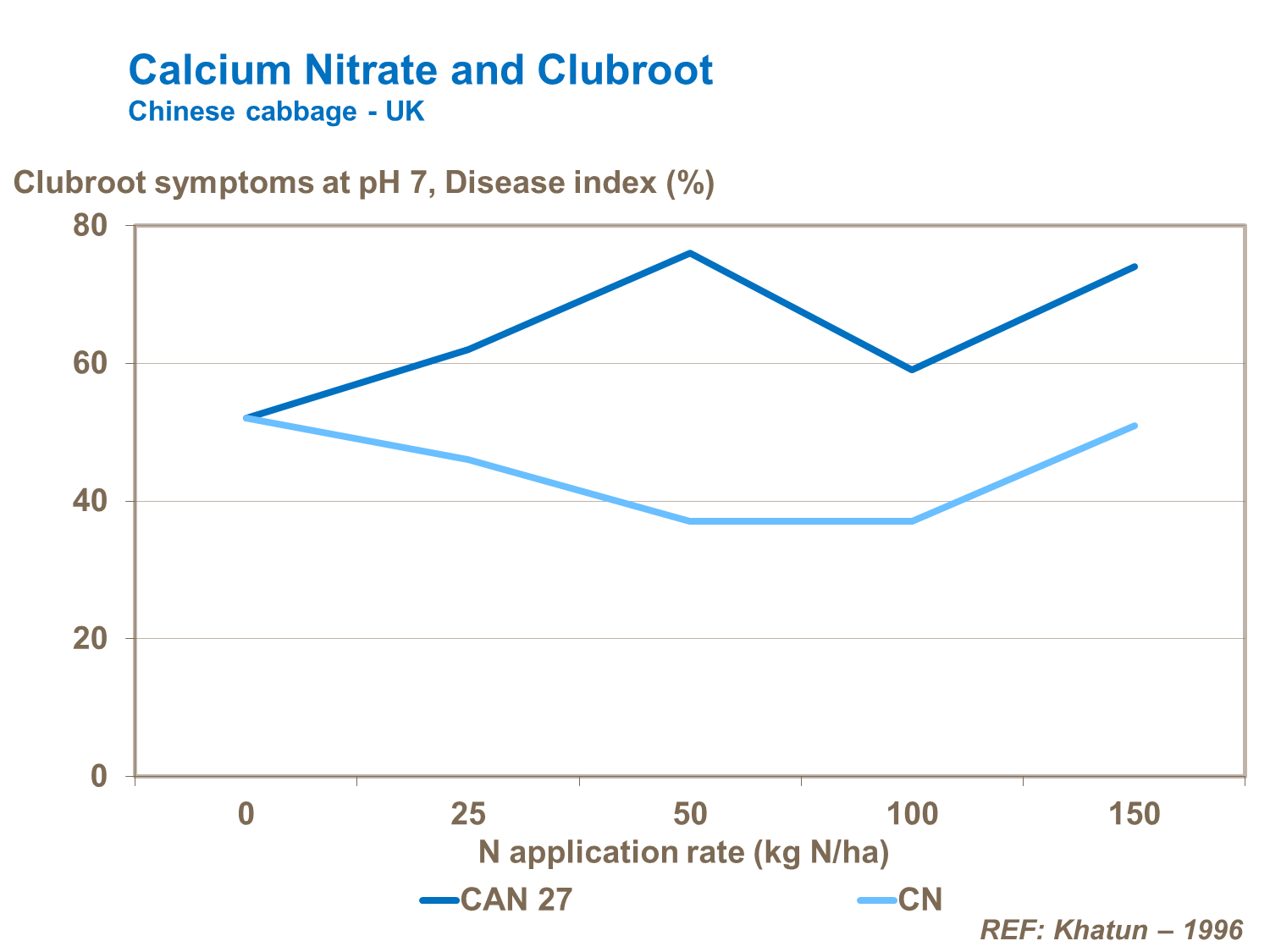 In addition, calcium, from highly soluble calcium nitrate, further minimizes the risk of club root infection. Other fertilizers and other calcium sources (e.g. CAN) are not as effective as calcium nitrate. There is an indication from some trials that in certain situations, boron can also play a role in minimizing clubroot.