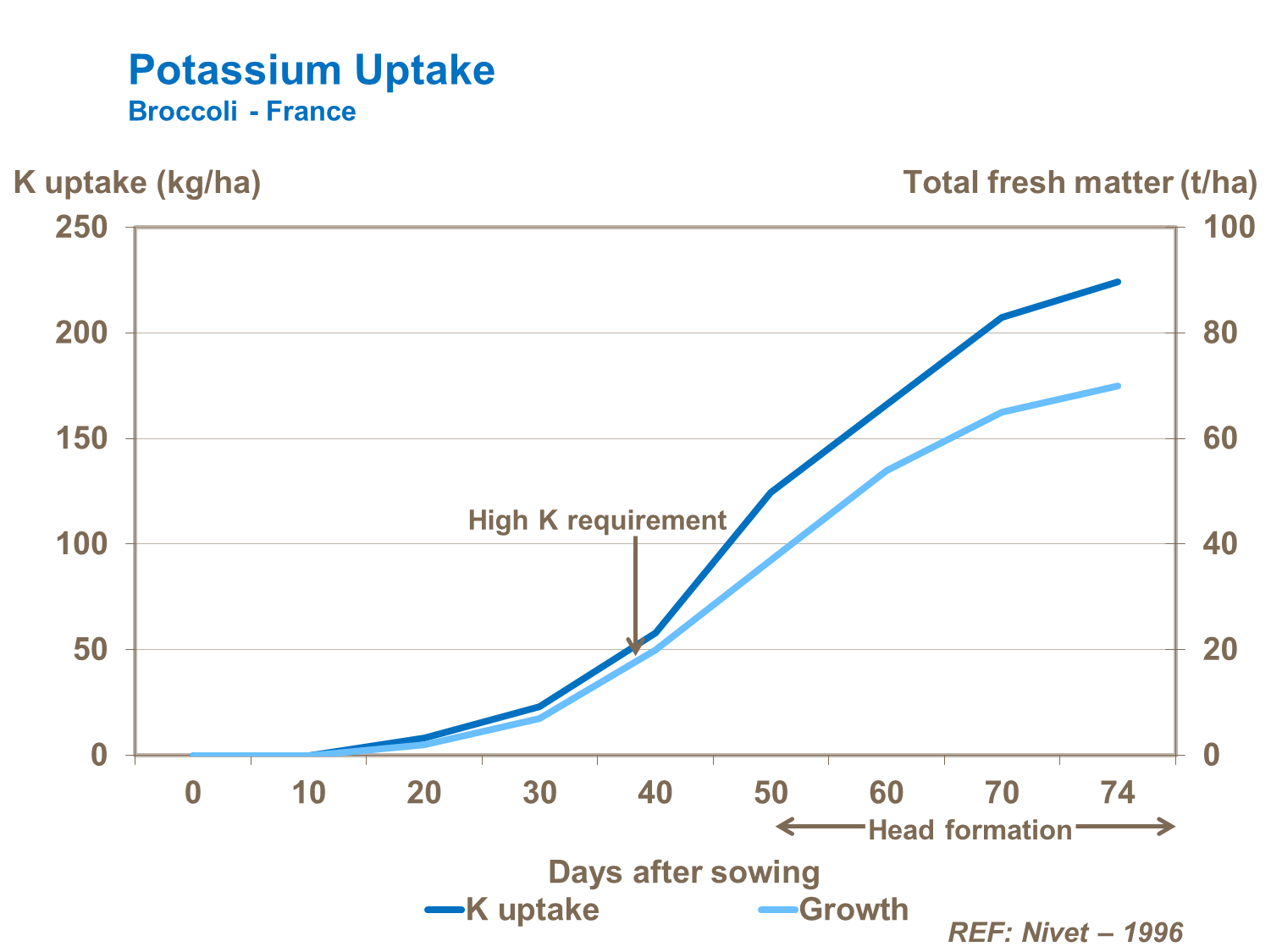 Potassium rates of 225 kg/ha and above produce responses on high yielding sites, increasing both plant biomass and resultant head weight and yield.